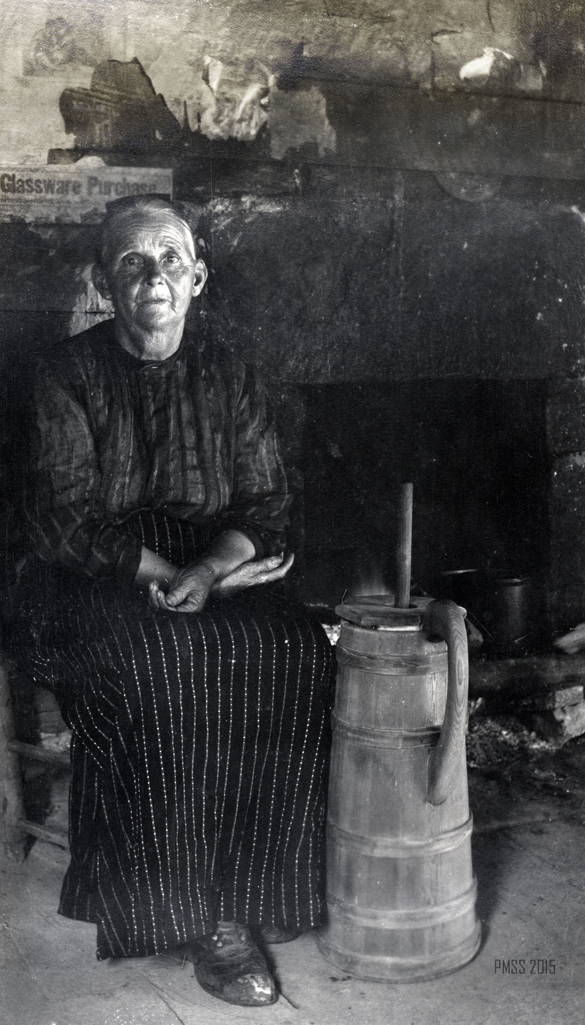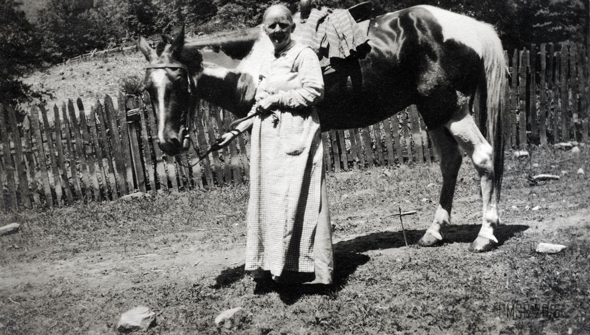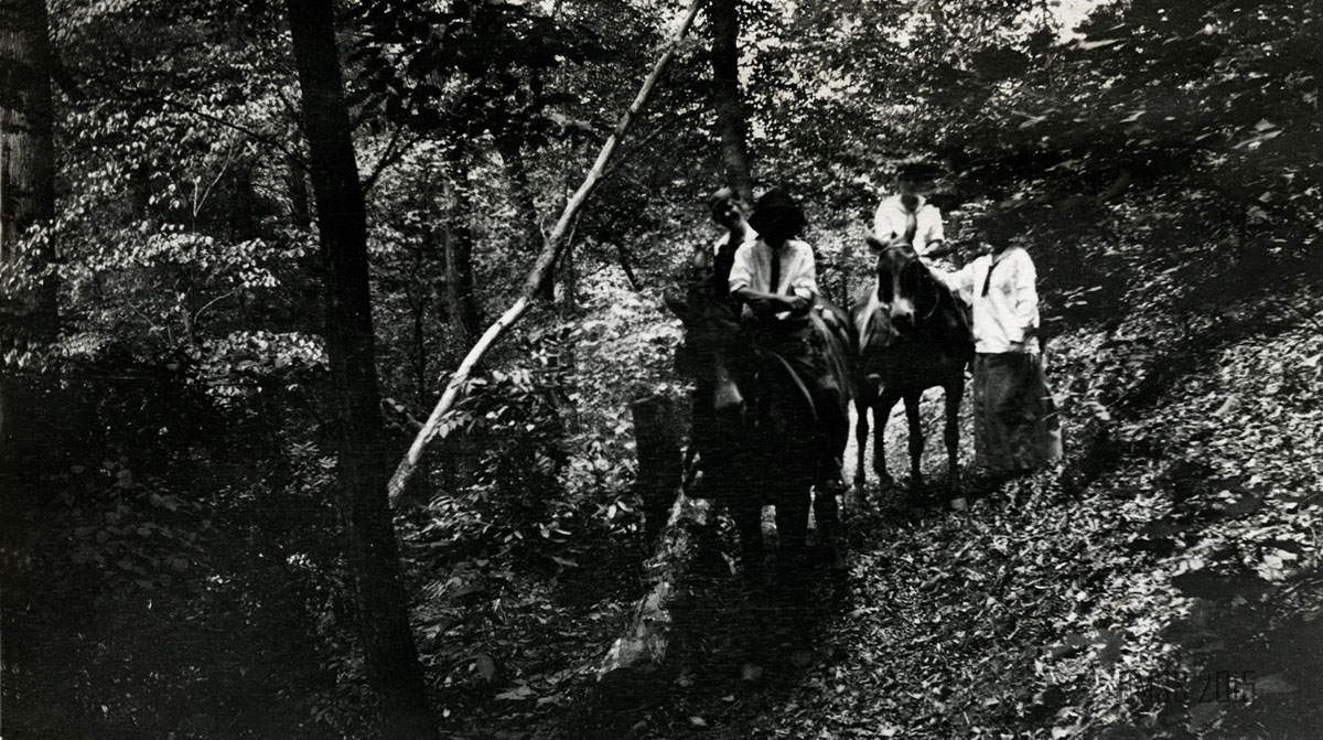 048a Meetin in the grove. [Two women: one at left and one at right sitting amidst trees, several others sitting in background.] ; 048b Two of the Turners. [Two men standing in front of the post office? to the left of the porch. Tobacco sign on side of building.] ; 049a Aunt Judy at home. [Woman sitting at left, churner at right, fireplace at back right.] ; 049b Aunt Judy Turner and the “pied nag.” [Woman standing in front of a horse, fence in background.] ; 050a Bringing flax and the breaker. [Two boys: one at left carrying flax over his shoulder, one at right carrying the breaker? over his shoulder.] ; 050b Swinging flax, Aunt Sal and Lizzie. [Older woman at left swinging flax, Elisabeth Roettinger? at right watching.] ; 051a Aunt Judy and Aunt Stacey Ellen arrive. [Two women: One at left standing next to a horse?, one at right standing next to a mule.]  ;051b “A Workin” Aunt Polly Ann, Aunt Stacey Ellen, Aunt Judy, and Aunt Sal. [Three women sitting, one on left holding a baby, one woman standing, two children in background at left and right.] ; 052a [Woman riding on a mule in the forest.] ; 052b [Woman standing by a tree holding a long stick in one hand.] ;052c Virgin forest. ; 053a Up Big Laurel. [Woman at left holding a walking stick?, mule? behind tree limbs.] ; 053b Peggie and Lizzie. [Two women: Elisabeth Roettinger at right? at the base of a giant yellow poplar?] ; 053c The giant yellow poplar. Columbus and Lizzie. [Elisabeth Roettinger? at left and man at right at base of tree.] ; 054a Ethel on Jack’s Gap. [Woman holding a walking stick with two hands, large rocks on the left, trees and branches on the right.]