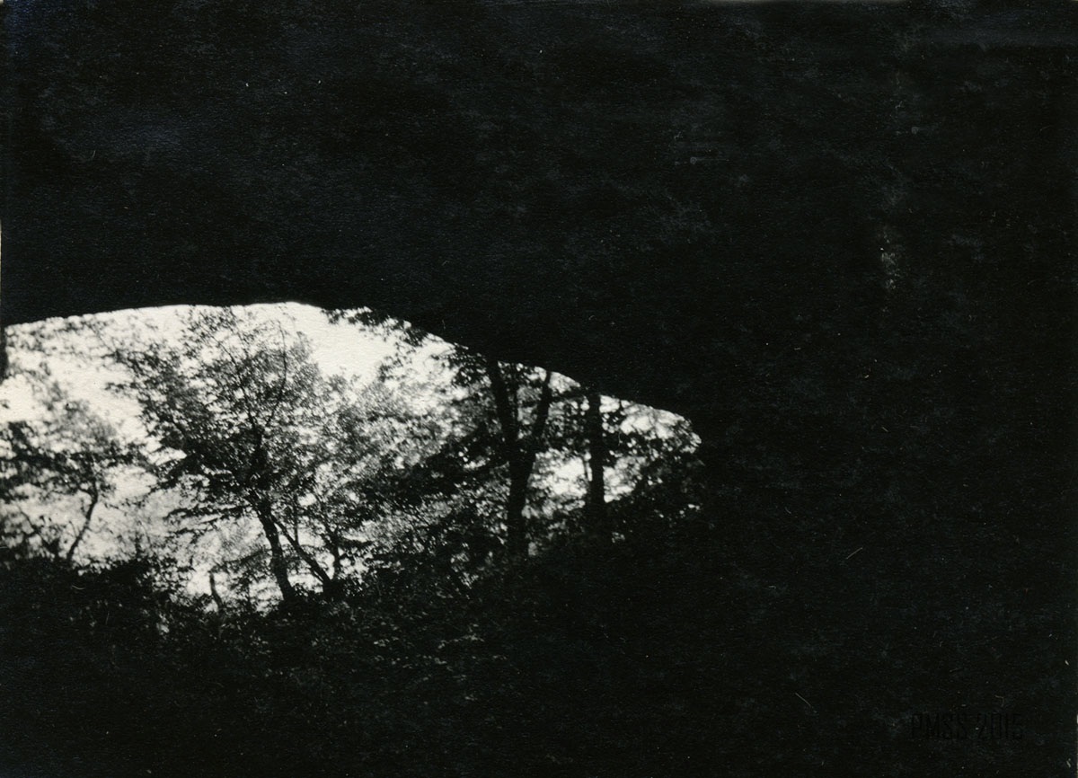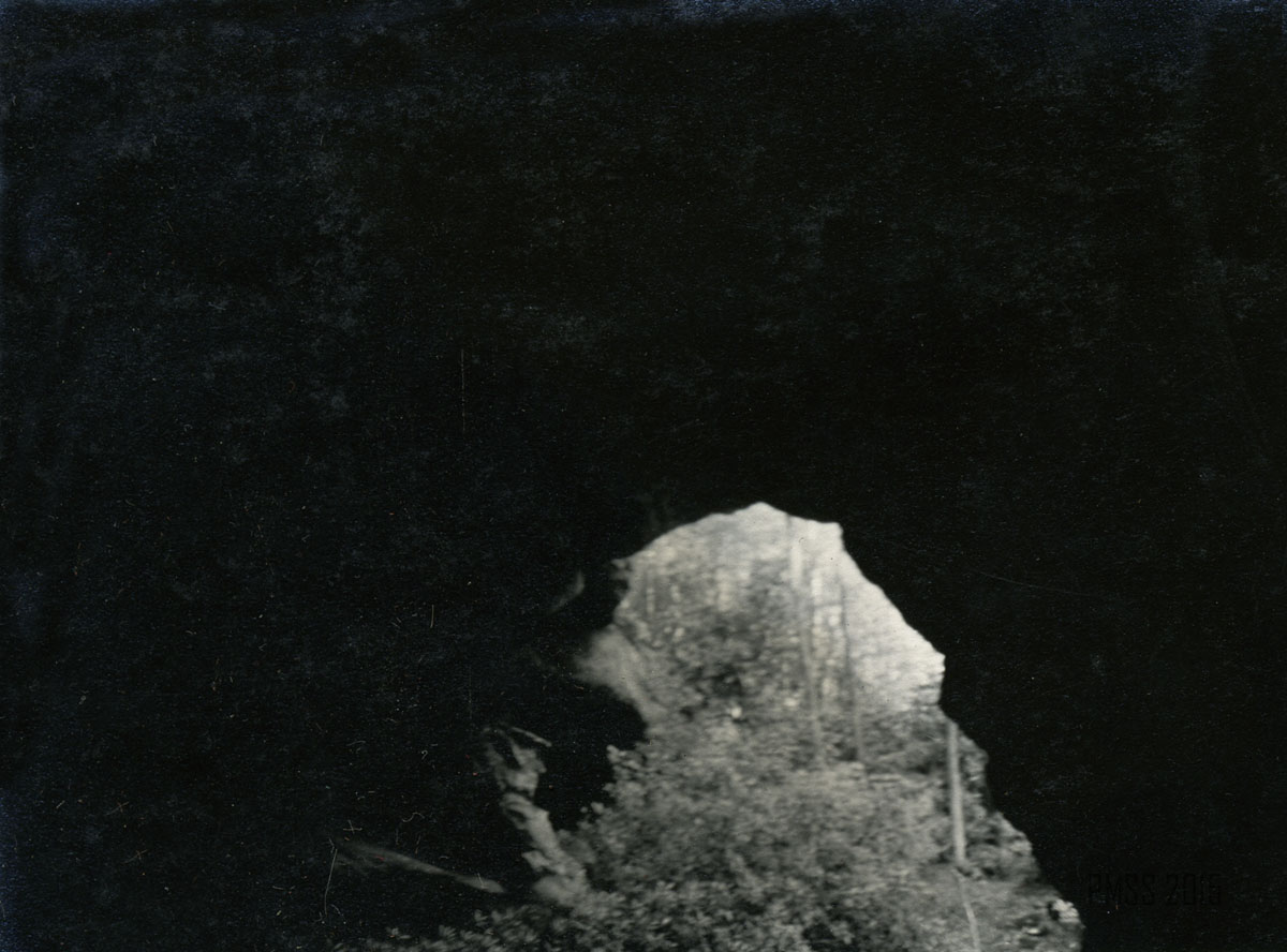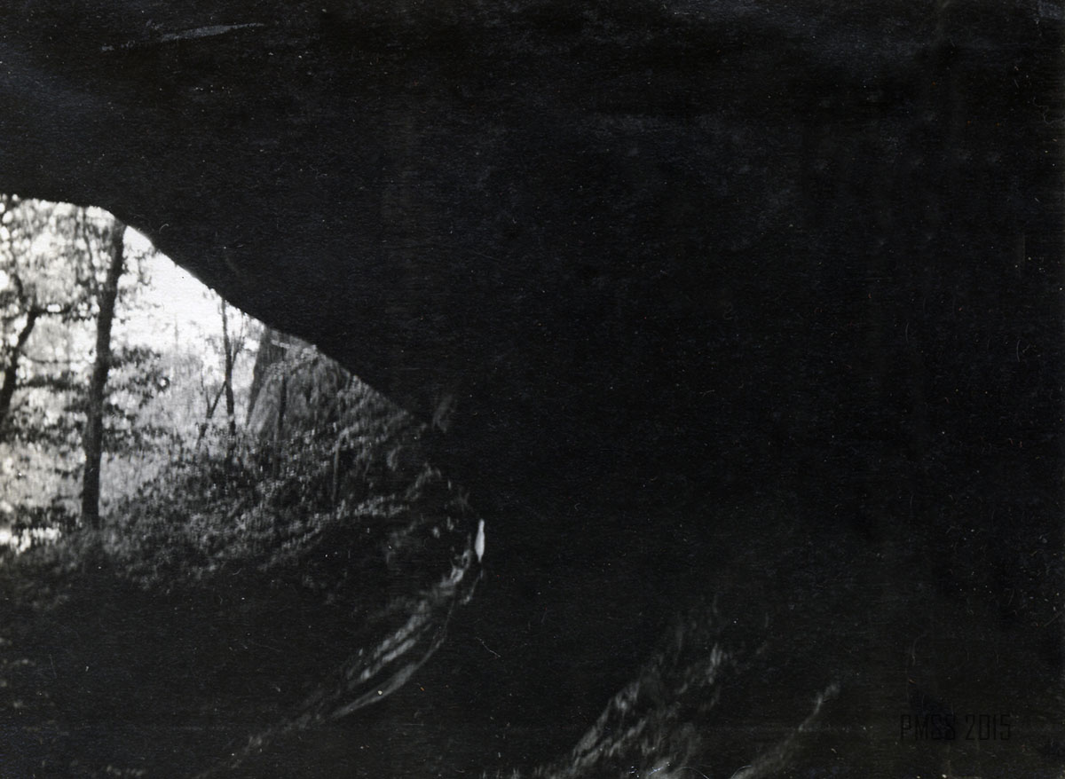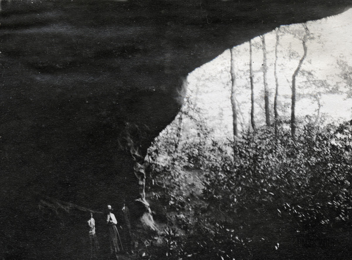 064a [View from inside the Raven’s Nest?]  ; 064b Looking out of the Raven’s Nest, a cave at the top of Pine Mountain near Poorfork. [Three people: two women, one man visible at bottom left; cave on right, view of the outside on left.] ; 065a [View from the Raven’s Nest, a cave at the top of Pine Mountain near Poorfork.]  ; 065b [View from the Raven’s Nest, a cave at the top of Pine Mountain near Poorfork.] ; 066a Log Rock. [Three men and two women standing a top a large rock that looks like a fallen log.] ; 066b Great Rock at the top of Pine Mountain. [Three people visible just past tree line in forefront.]