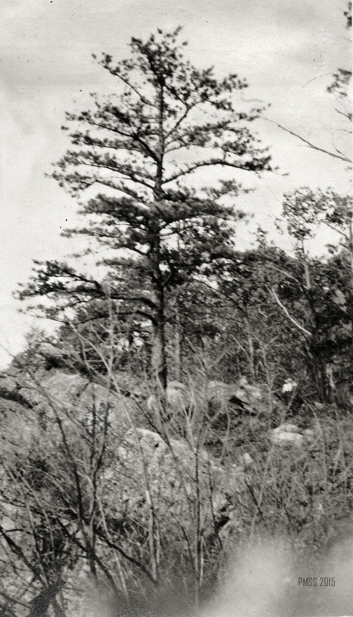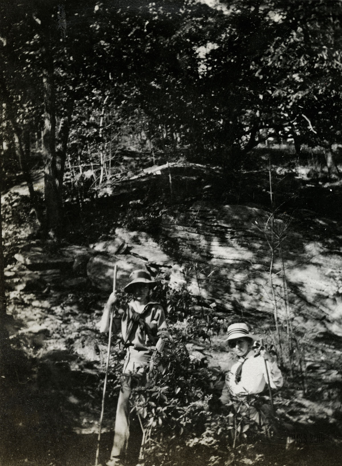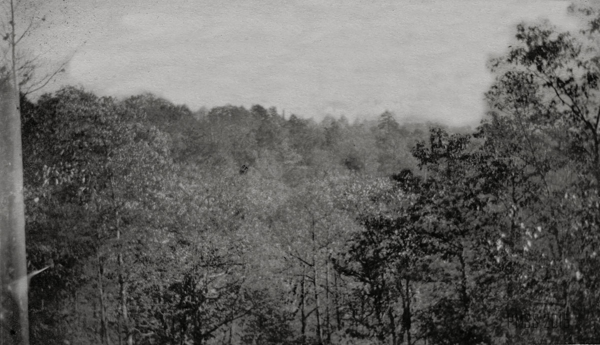 064a [View from inside the Raven’s Nest?]  ; 064b Looking out of the Raven’s Nest, a cave at the top of Pine Mountain near Poorfork. [Three people: two women, one man visible at bottom left; cave on right, view of the outside on left.] ; 065a [View from the Raven’s Nest, a cave at the top of Pine Mountain near Poorfork.]  ; 065b [View from the Raven’s Nest, a cave at the top of Pine Mountain near Poorfork.] ; 066a Log Rock. [Three men and two women standing a top a large rock that looks like a fallen log.] ; 066b Great Rock at the top of Pine Mountain. [Three people visible just past tree line in forefront.]