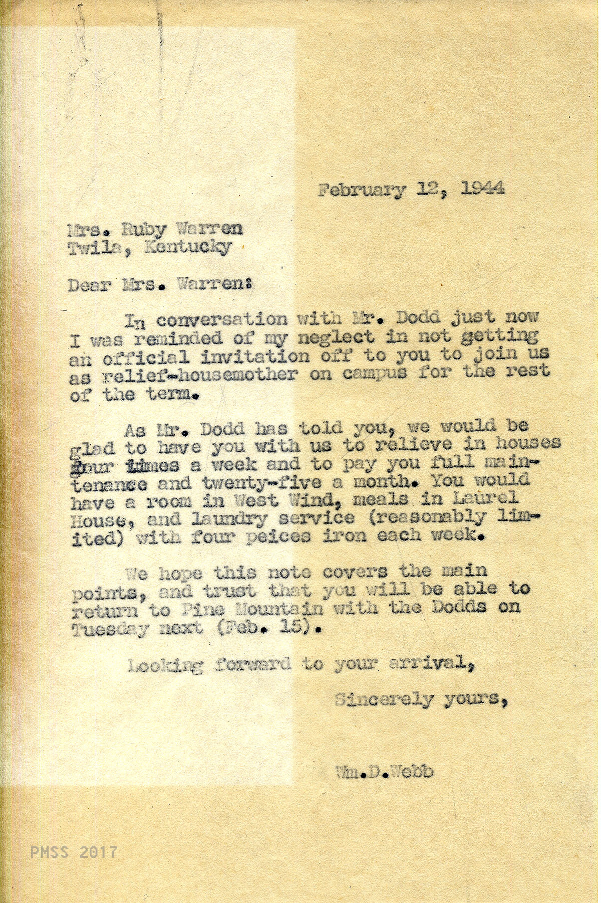 As Mr. Dodd has told you, we would be glad to have you with us to relieve in houses four times a week and to pay you full maintenance and twenty-five a month. You would have a room in West Wind, meals in Laurel House, and laundry service (reasonably limited) with four pieces iron each week. …”