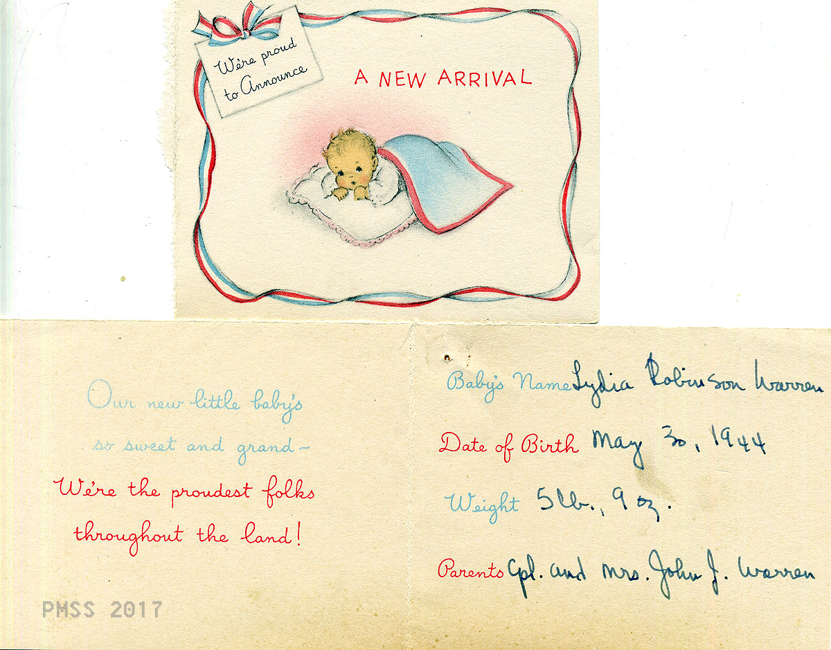 [warren_john_ruby_002.jpg] Birth announcement of Lydia Robinson Warren, born May 30, 1944, to Cpl. and Mrs. John J. Warren.