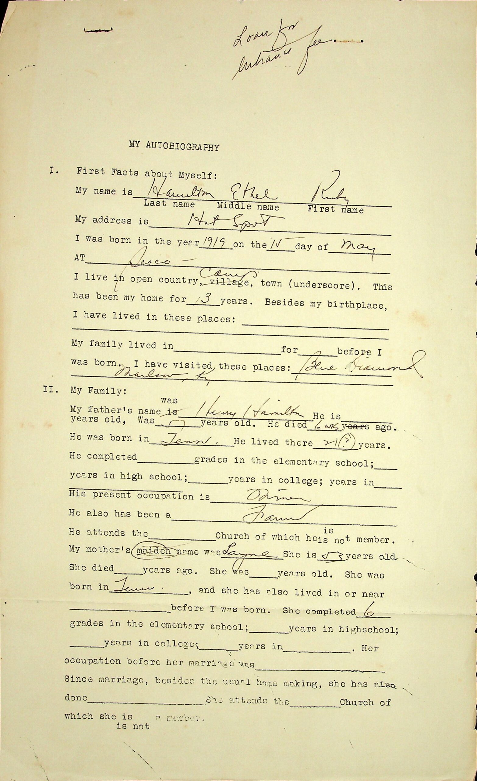 01 (5 pages, N.D.) MY AUTOBIOGRAPHY: Ruby Ethel Hamilton