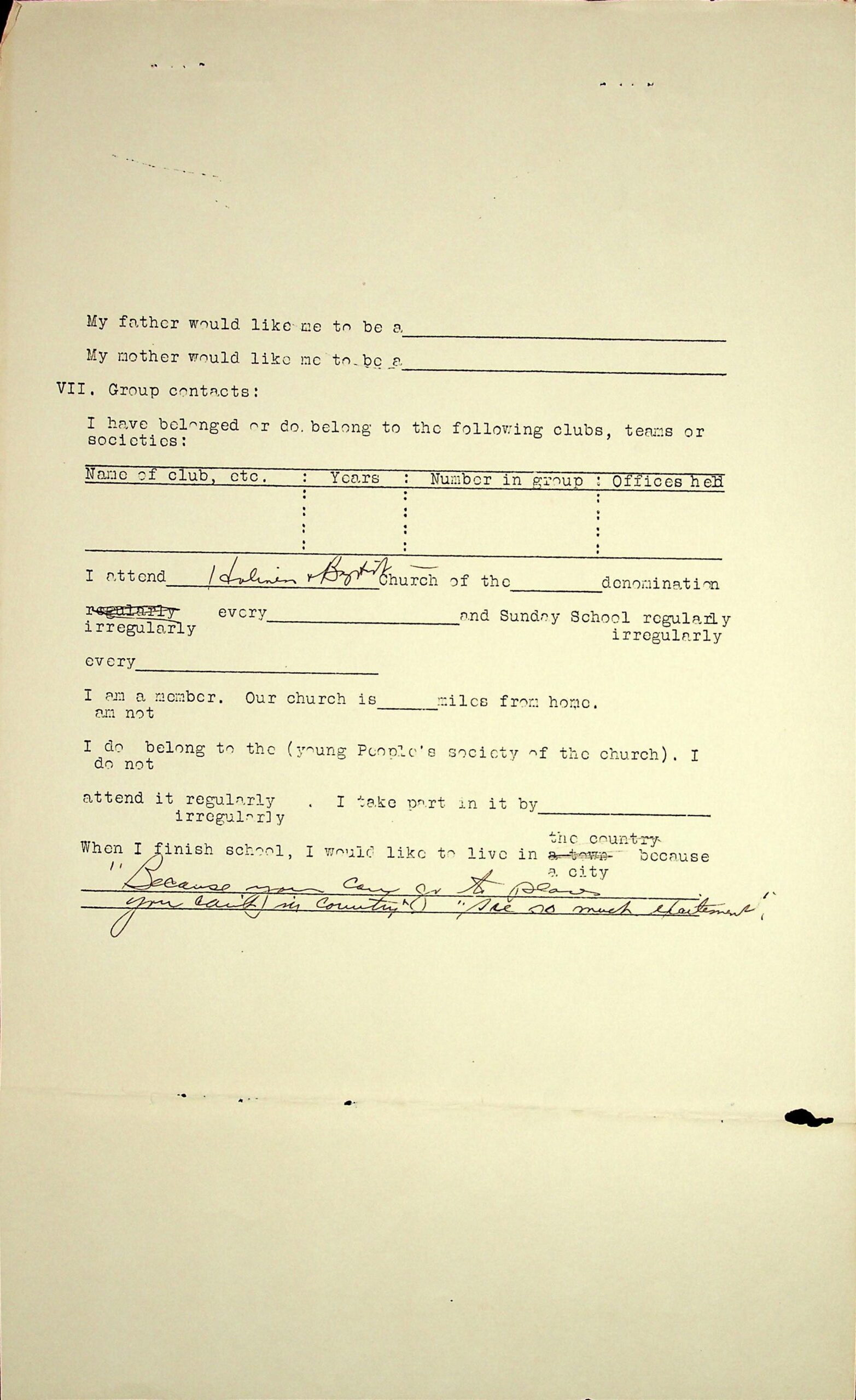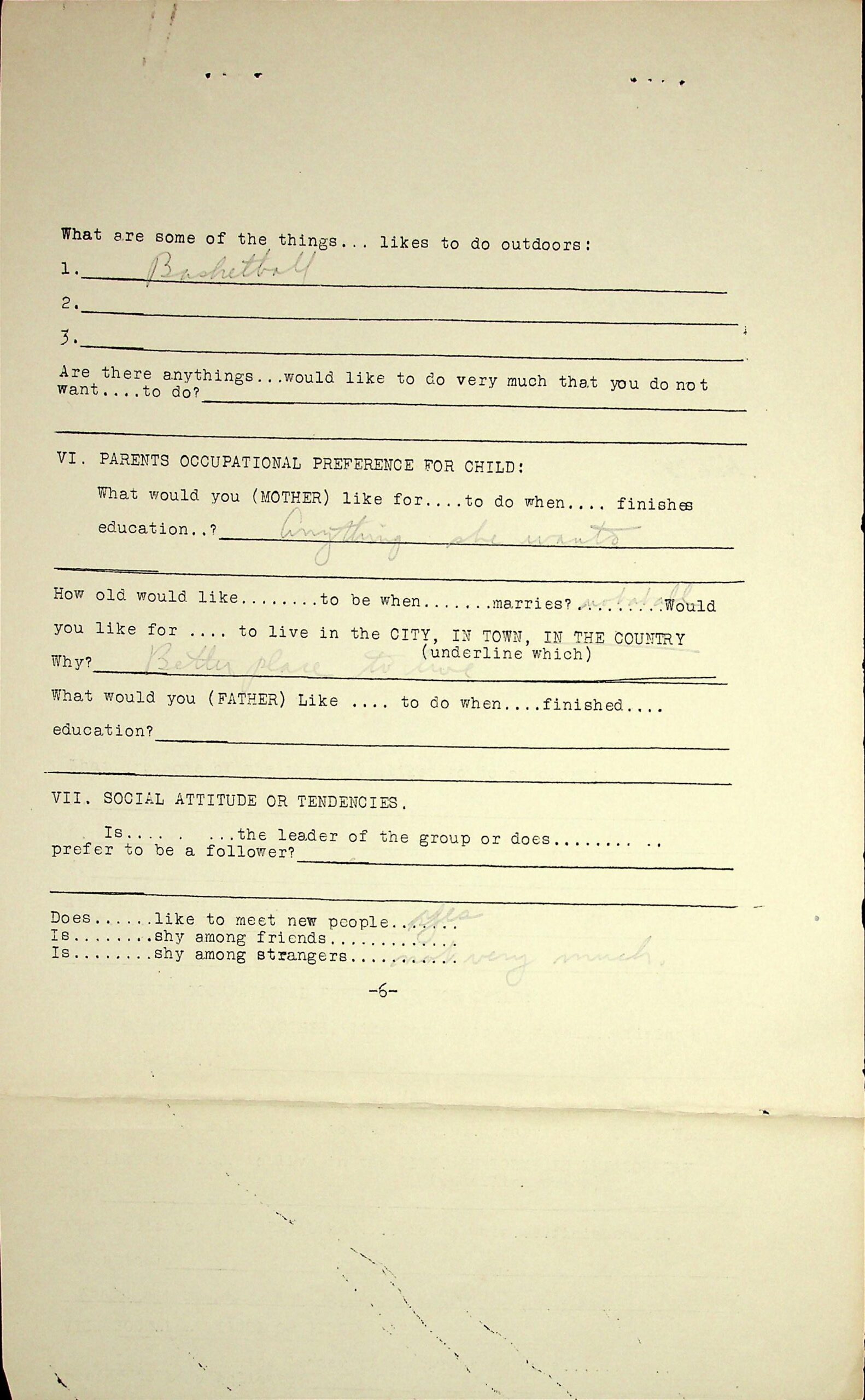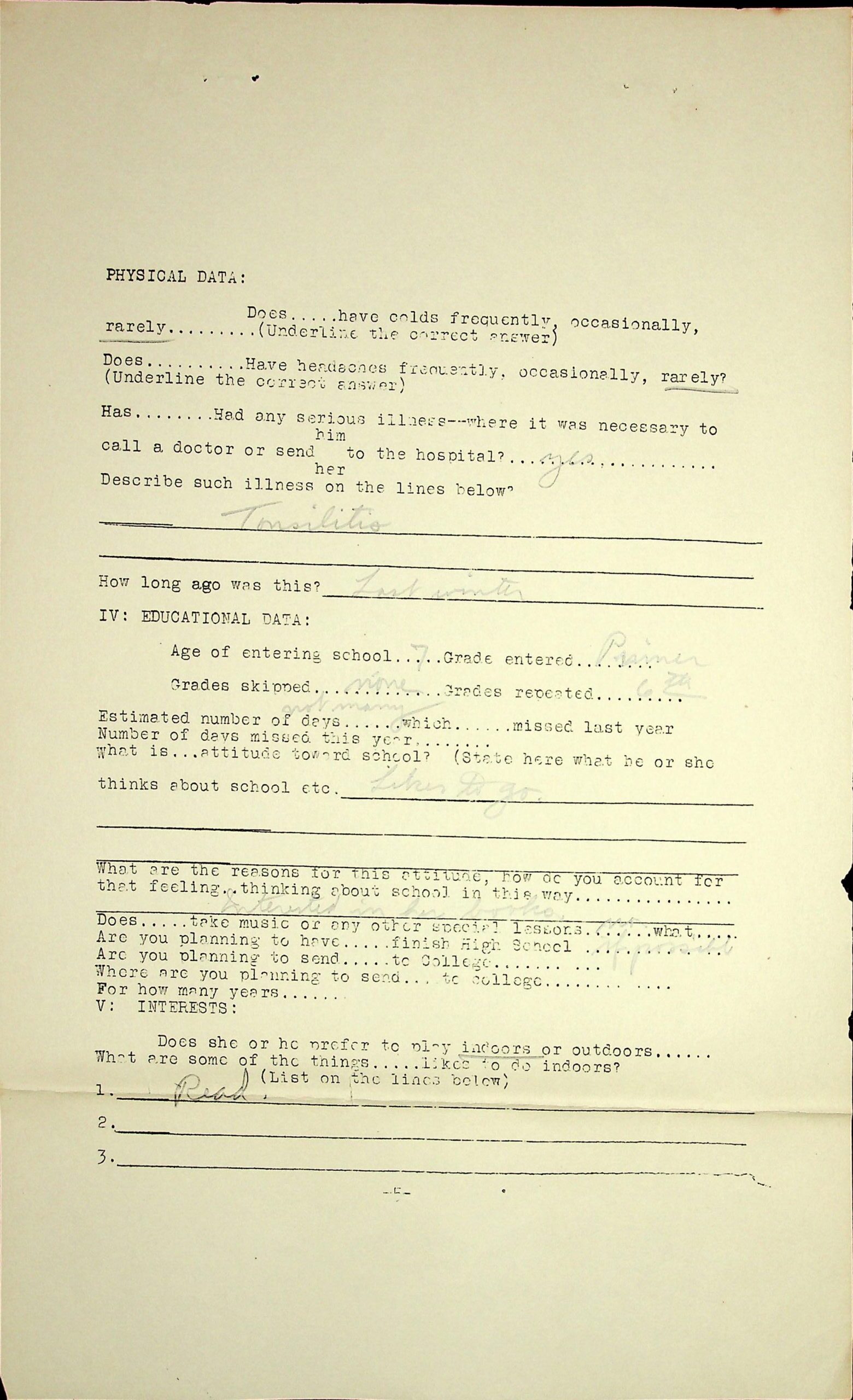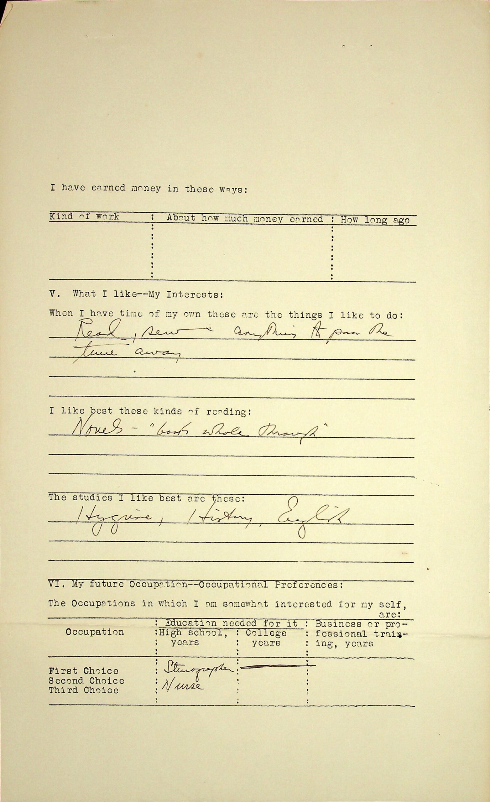 04 My interests: Read, sew; my favorite studies: hygiene, history, English; future occupation preferences: stenographer, nurse.