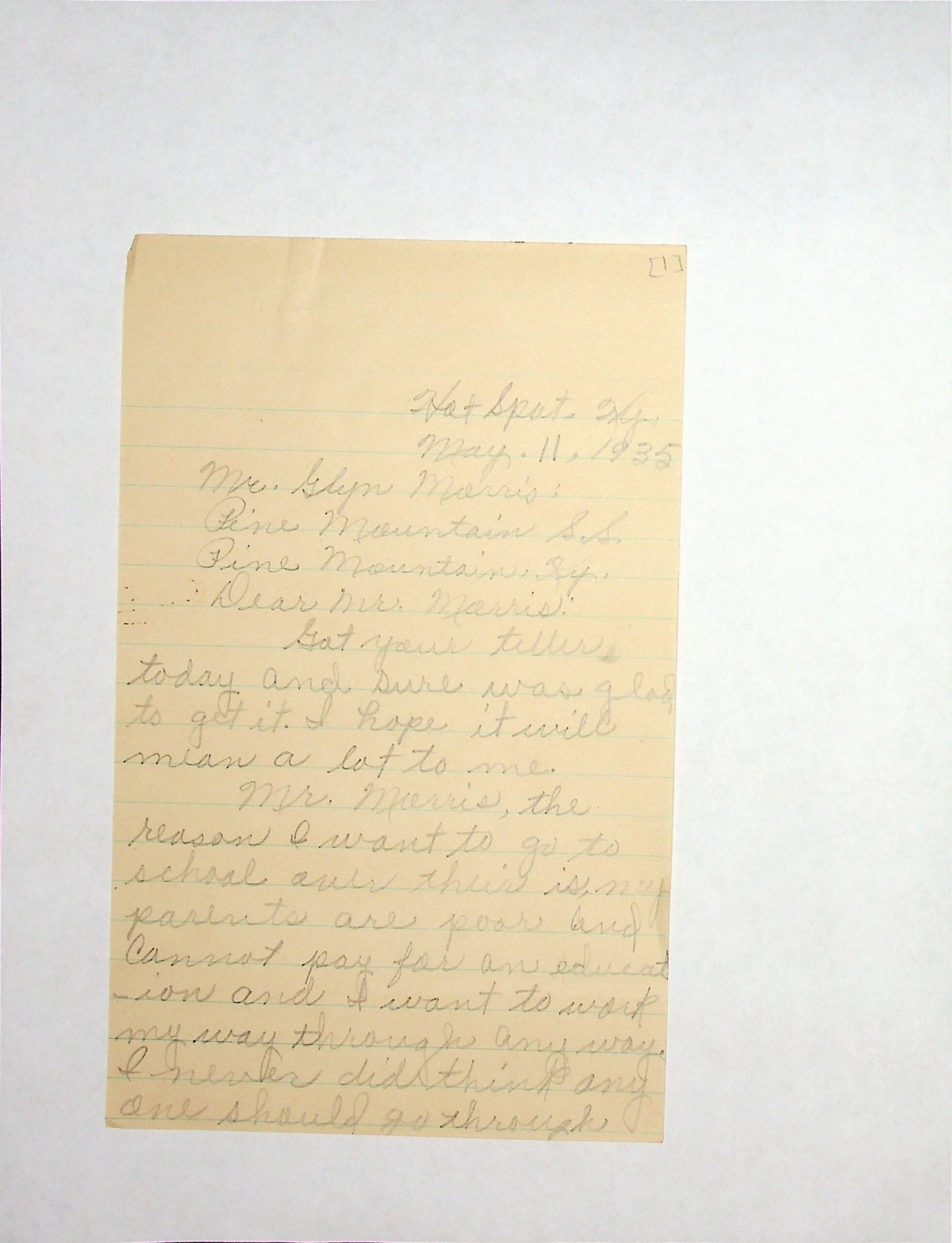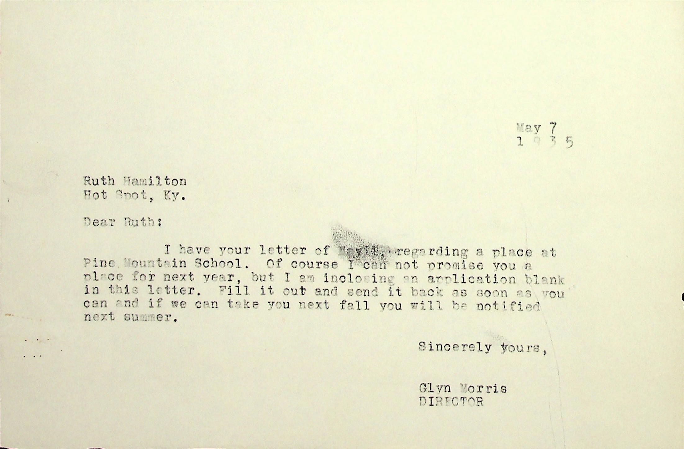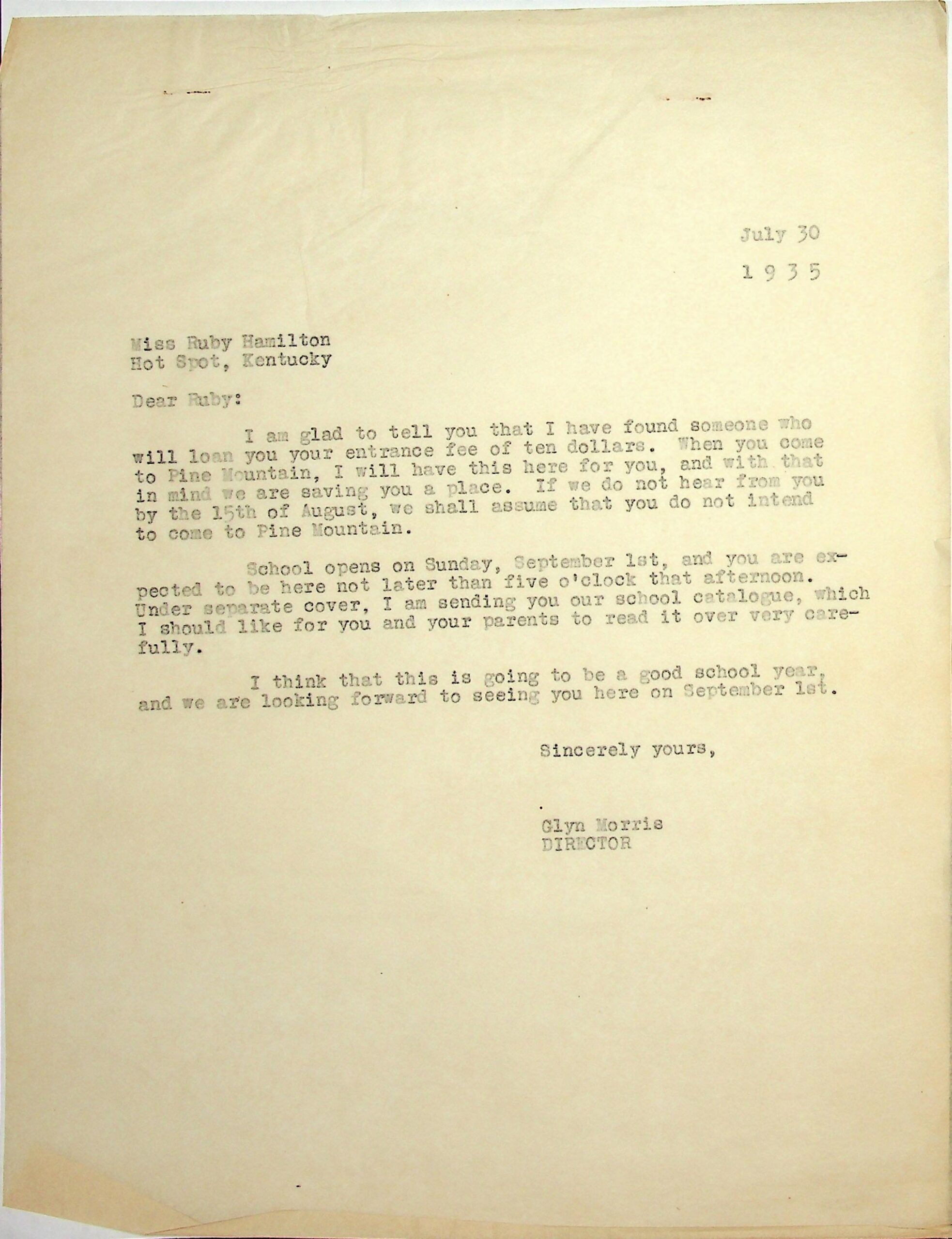 12 May 2, 1935. To Glyn Morris, PMSS [director], from Ruby Hamilton, Hot Spot, Ky., asking to be admitted into PMSS. She is 15 years old and in the eighth grade. “I want to work my way through if you allow it.”