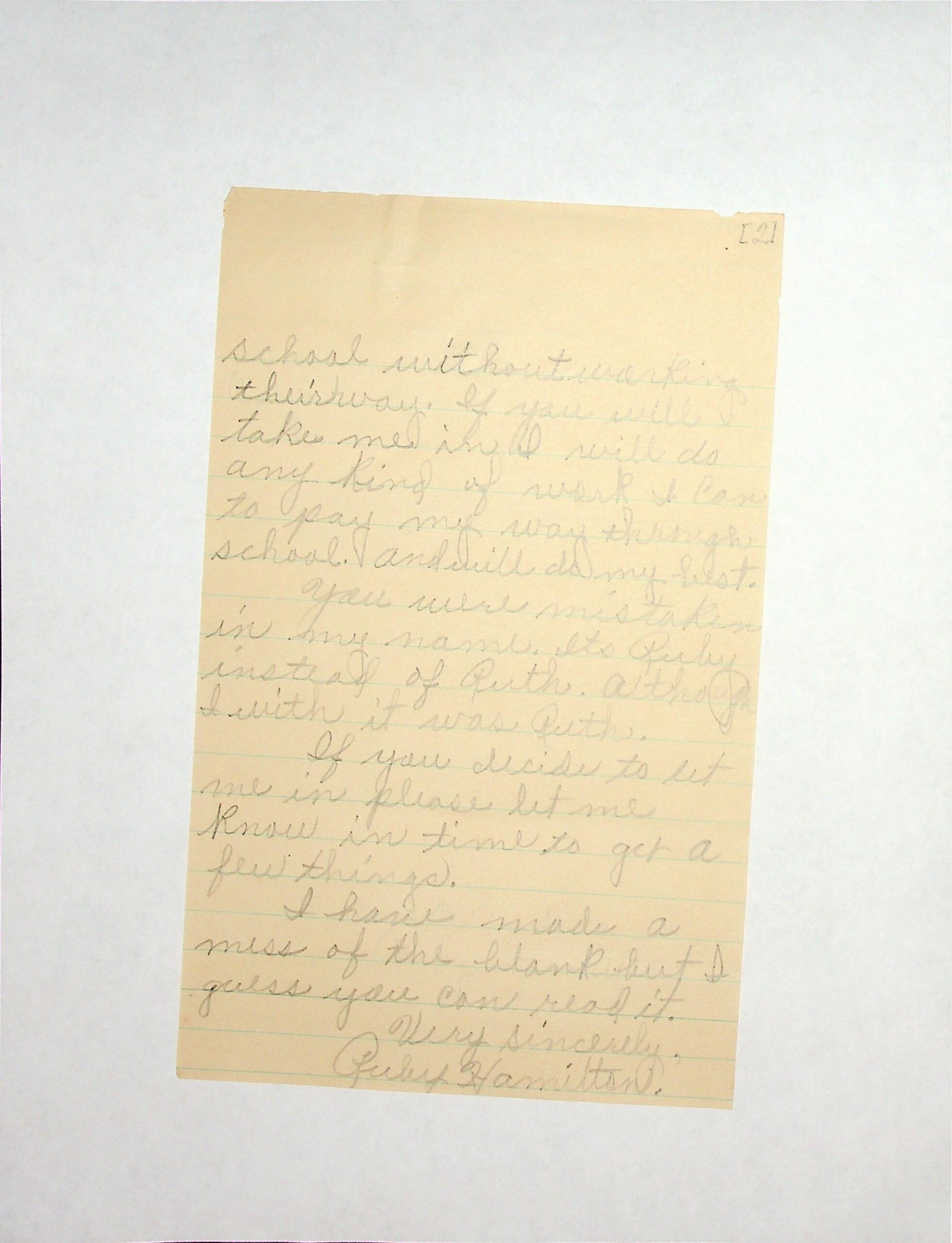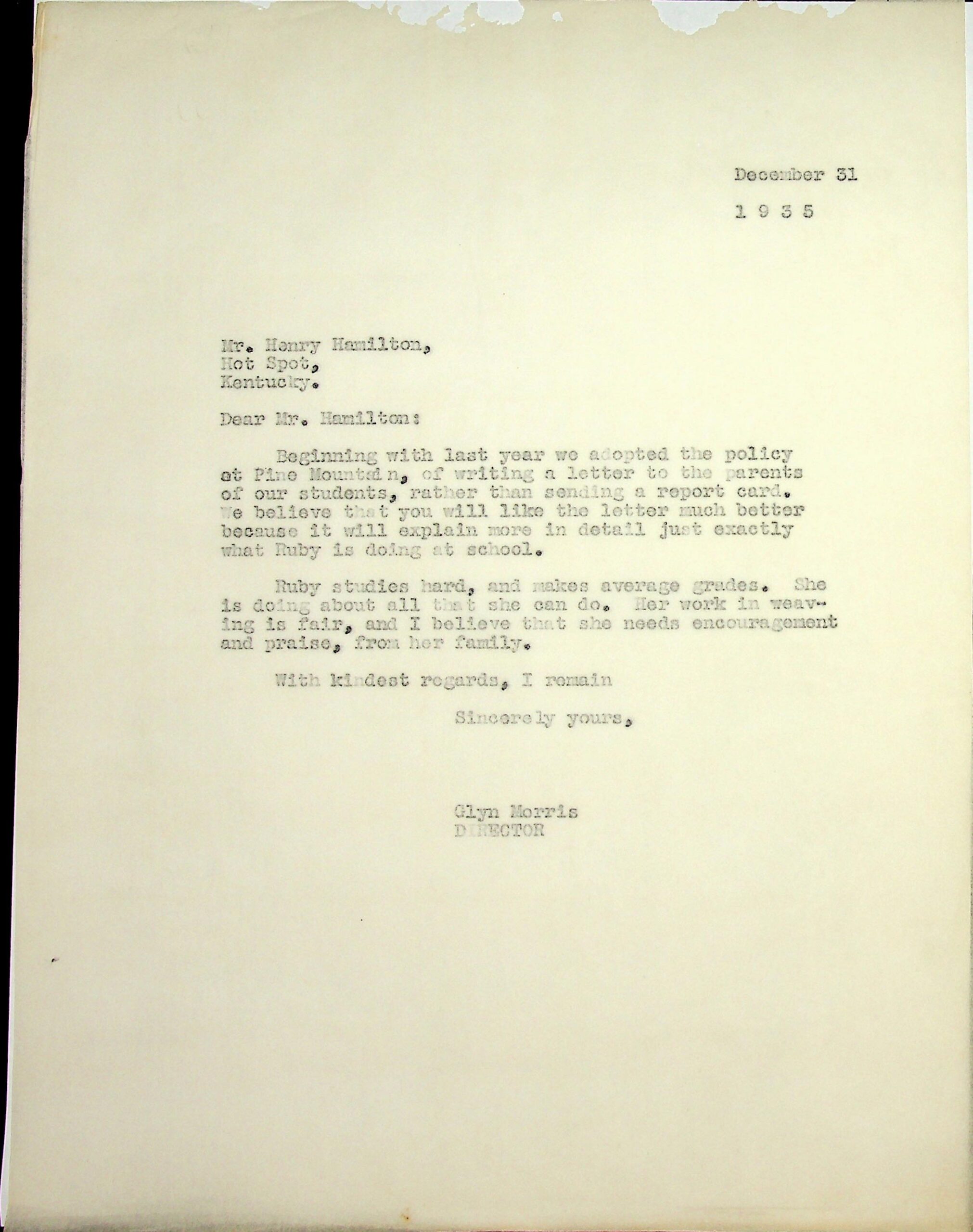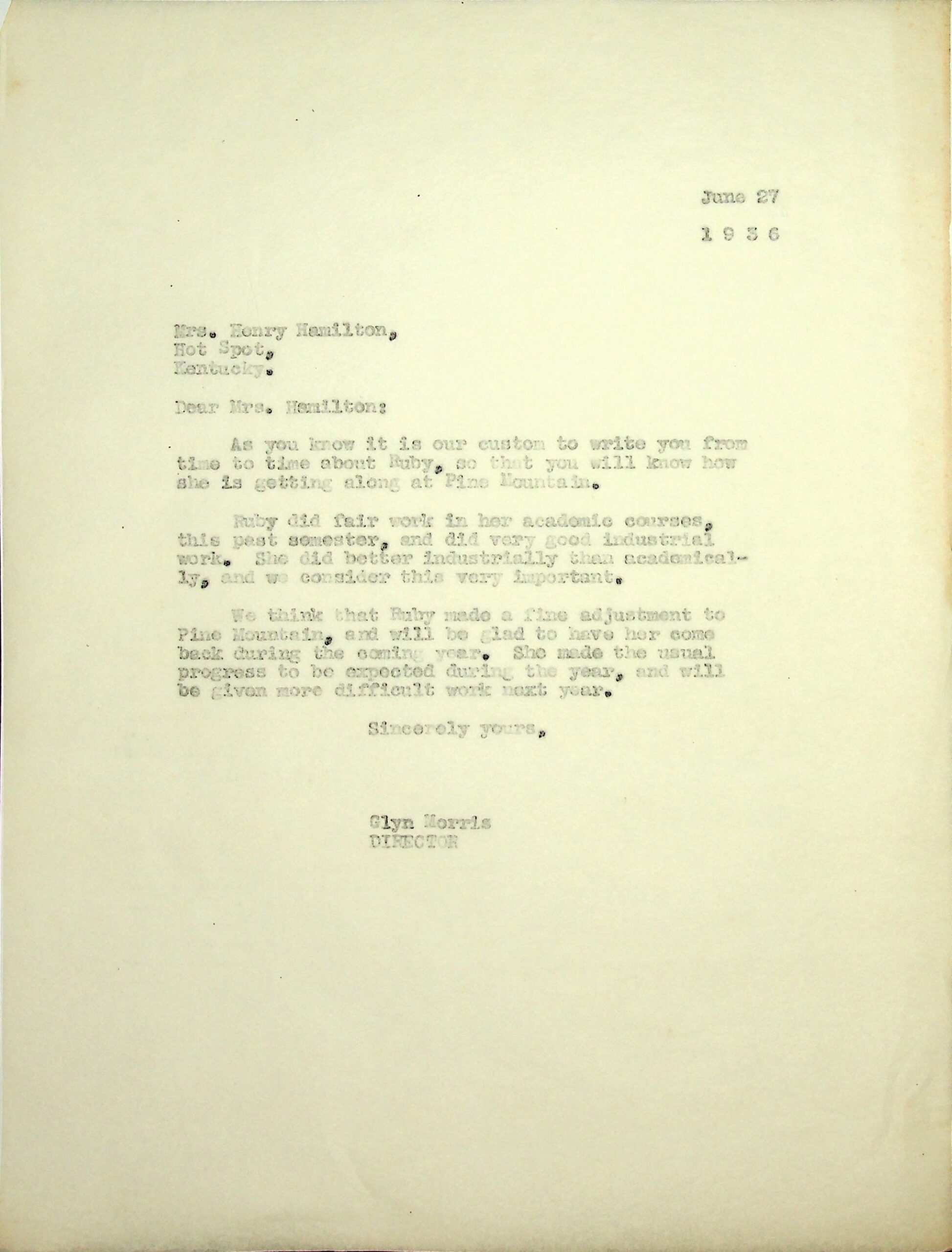 12 May 2, 1935. To Glyn Morris, PMSS [director], from Ruby Hamilton, Hot Spot, Ky., asking to be admitted into PMSS. She is 15 years old and in the eighth grade. “I want to work my way through if you allow it.”