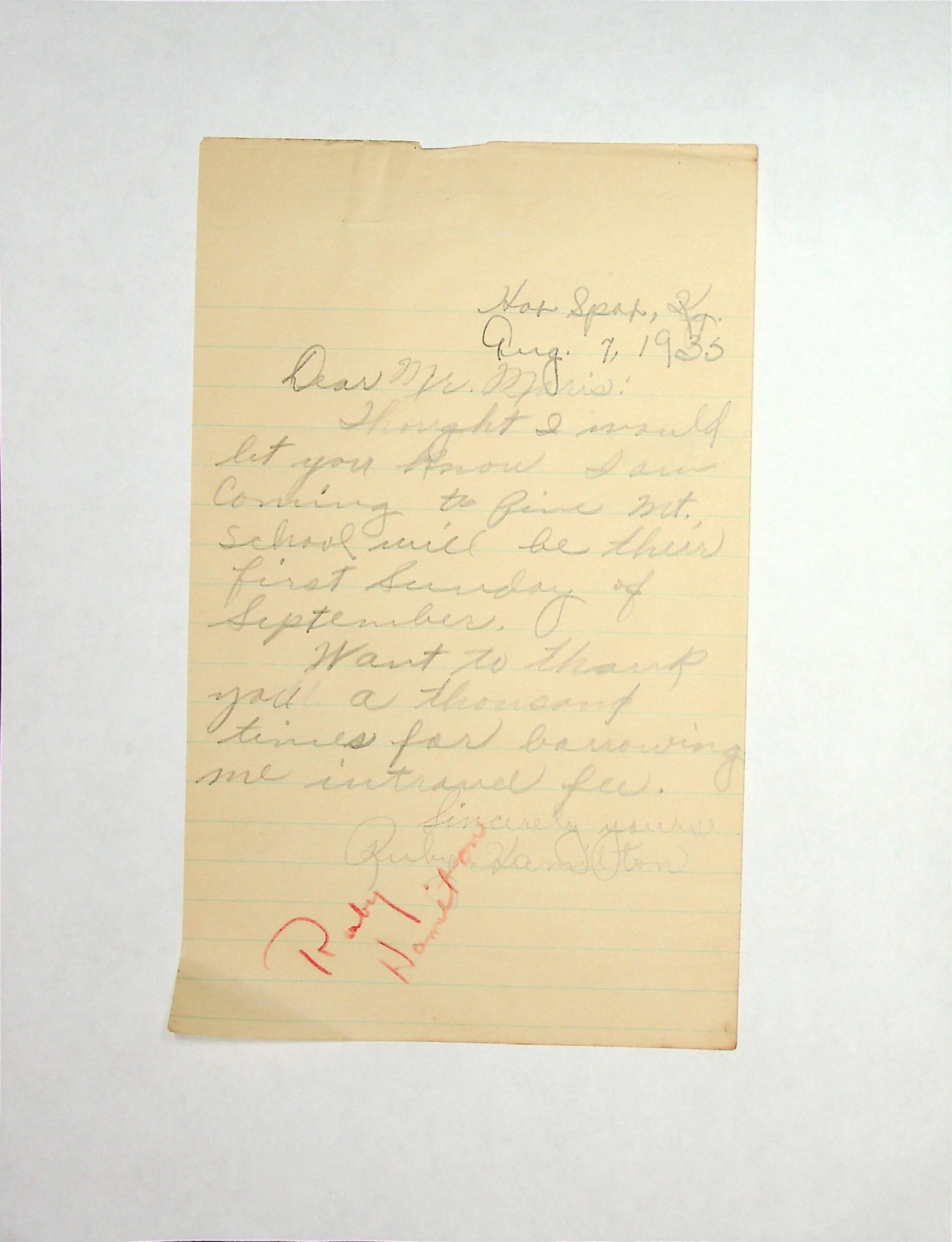 17 August 7, 1935. To Morris from Ruby, confirming that she will be coming to Pine Mountain School and thanking him for borrowing her entrance fee.