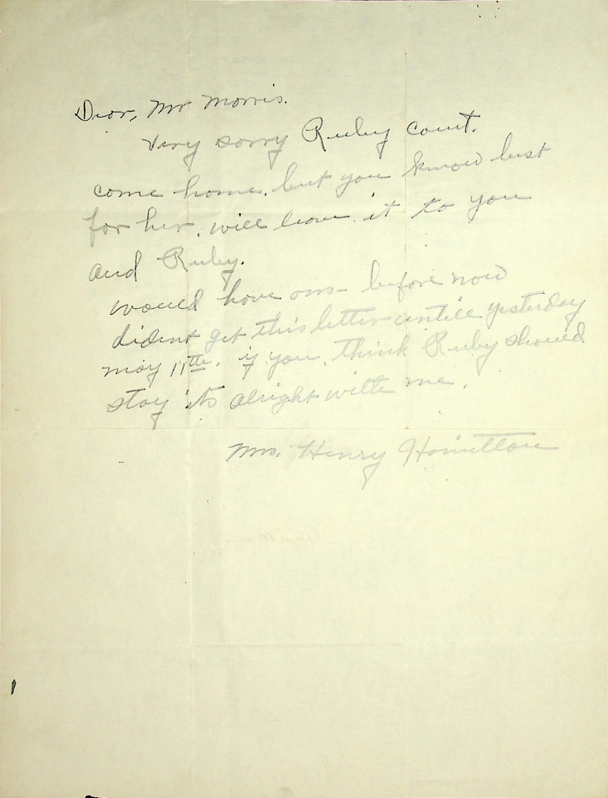 21 [N.D.] To Morris from Mrs. Henry Hamilton. “Very sorry Ruby can’t come home but you know best for her. Will leave it to you and Ruby.”