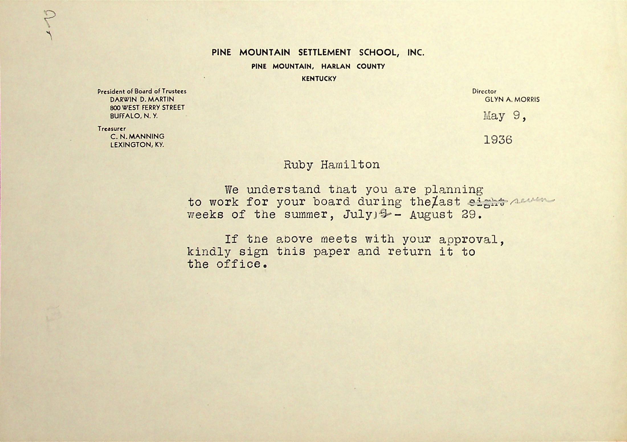 20 May 6, 1936. To Mr. (sic) Hamilton from Morris, asking for thoughts about Ruby staying at PMSS for the summer in a special program to work “several hours a day to pay for [her] board and the rest of the time will be given over to supervised activities, such as swimming, hiking, handcrafts, etc.” Ruby has shown a “desire to spend her last eight weeks of the summer here.”