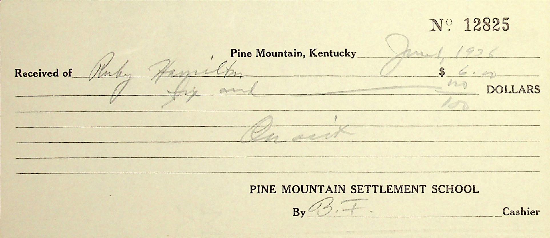 23 June 1, 1936. PMSS receipt from “B.F., Cashier” for Ruby’s payment of $6.00.