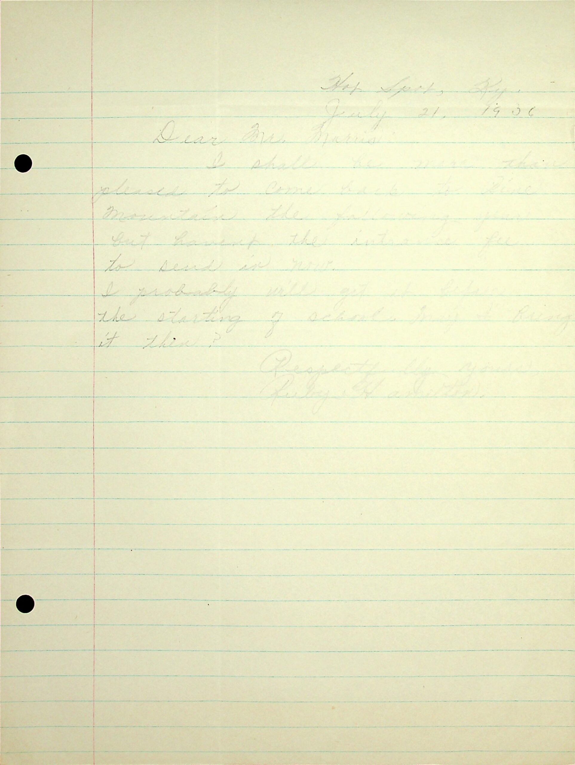 26 July 21, 1936. To Morris from Ruby, confirming that she “shall be more than pleased to come back to Pine Mountain the following year….” She hasn’t the entrance fee now and asks if she can pay later.