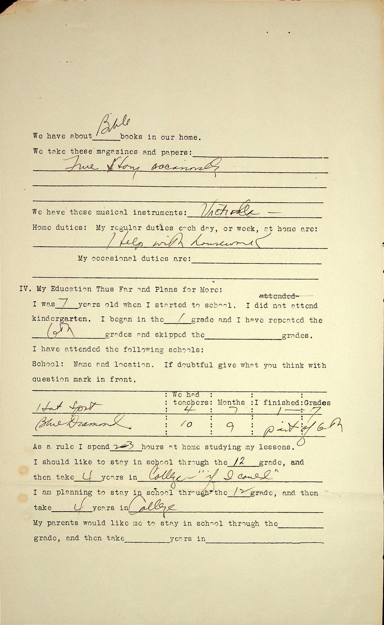 03 Books at home (4), subscriptions, musical instruments (“Victrola”), duties. My education thus far and plans for more: Schools attended were Hot Spot and Blue Diamond; “I should like to stay in school through the 12th grade and then take 4 years in “college – ‘If I could.’”