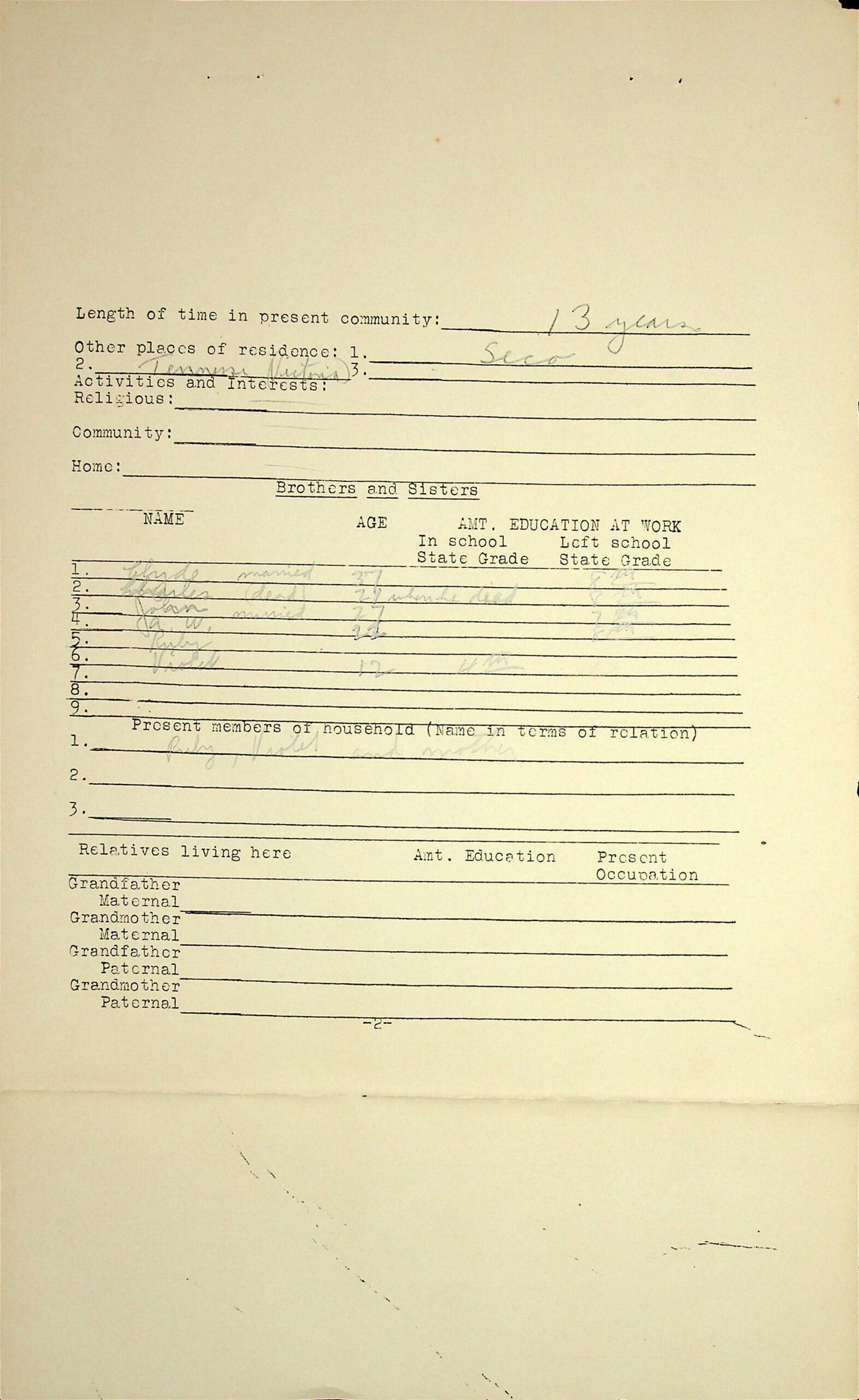 07 Lived in present community for 13 years. Also lived in Seco and Victoria(?), Tenn. Brothers and sisters: [see above]. Present members of household: “Ruby, Violet, and mother.”