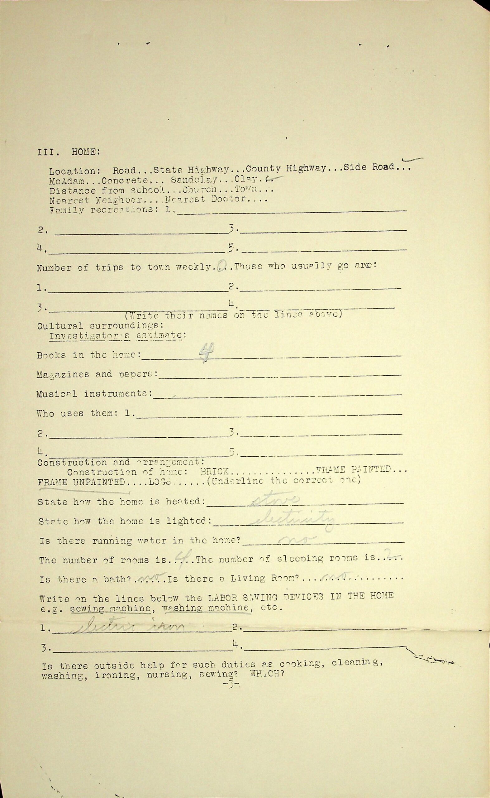 08 Home is heated by stove and lighted by electricity; no running water; 4 rooms.