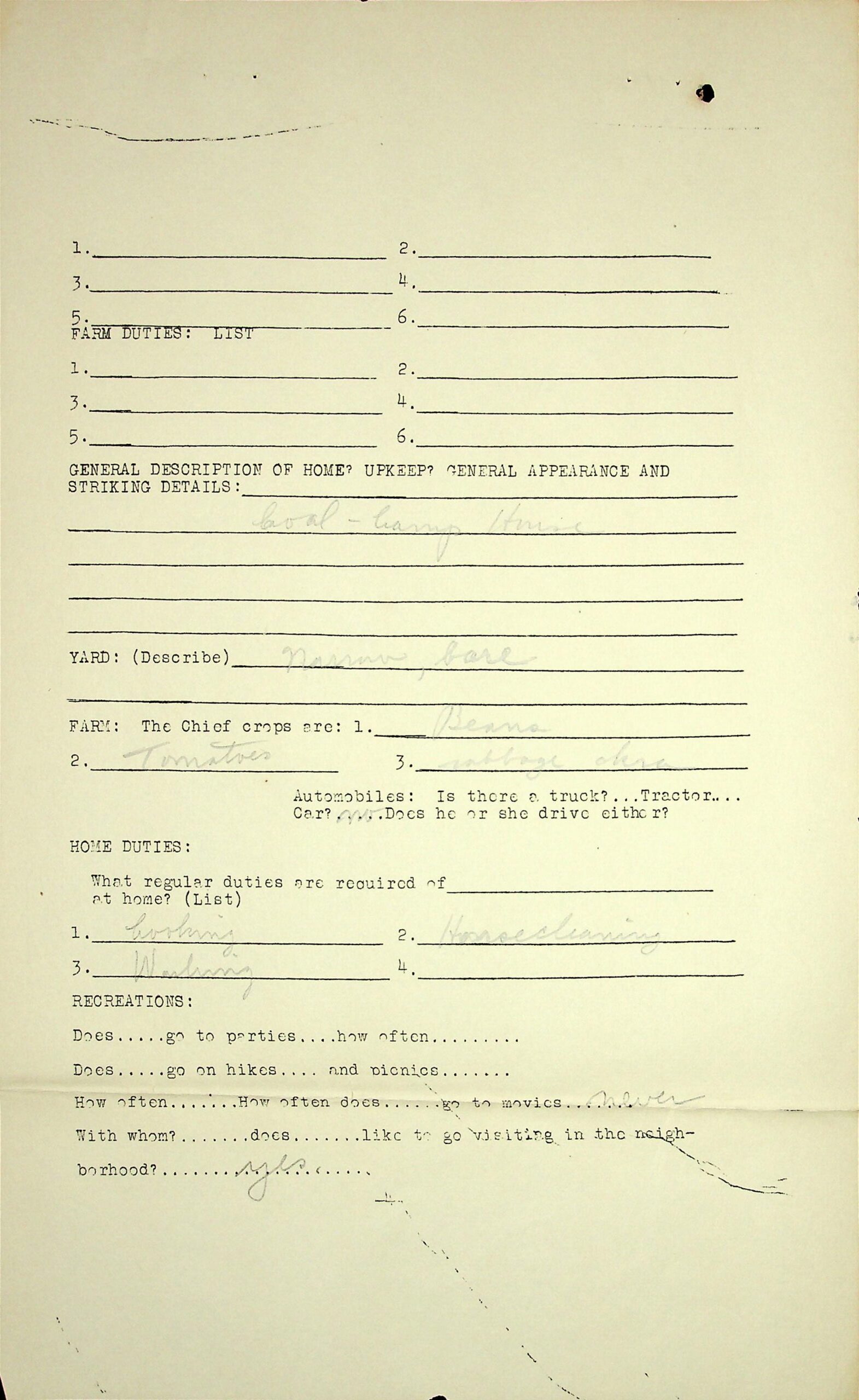 09 General description of home: “coal-camp house.” Chief crops: beans, tomatoes, cabbage, okra. Home duties; Recreation.