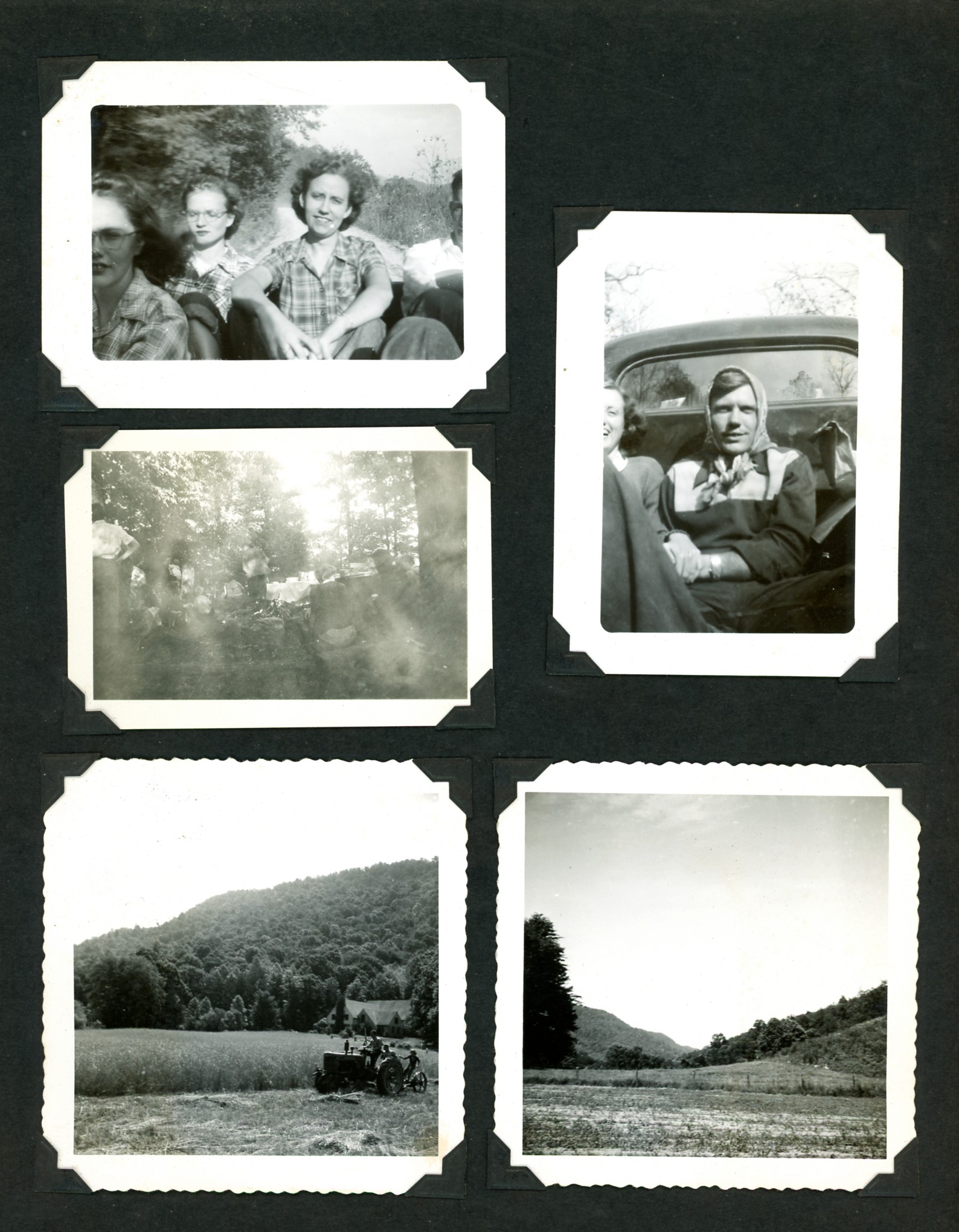 005 Three photos of people; tractor cutting hay in front of Laurel House; view of field and mountains. (5 photos)