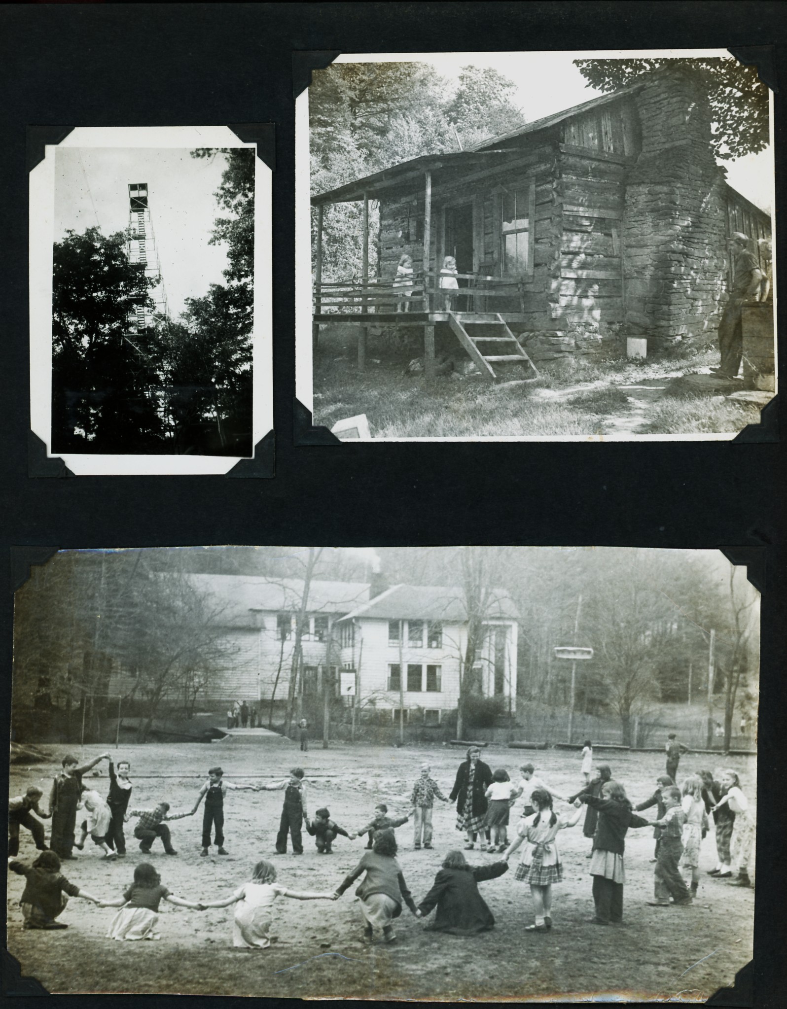 019 Fire Tower on Pine Mountain; cabin with two children on porch; circle game on playground near Burkham Schoolhouse.