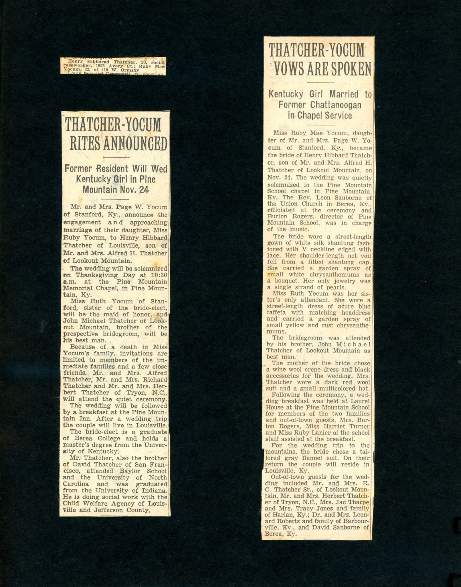029 Two newspaper announcements of Thatcher-Yocum marriage. “Thatcher-Yocum Rites Announced“; “Thatcher-Yocum Vows are Spoken.”