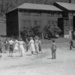 009 Teacher Yocum on playground with students; student Sammie Ely; Yocum standing at PMSS sign; unidentified cabin; Delma Huff and Rita Mae Williams.