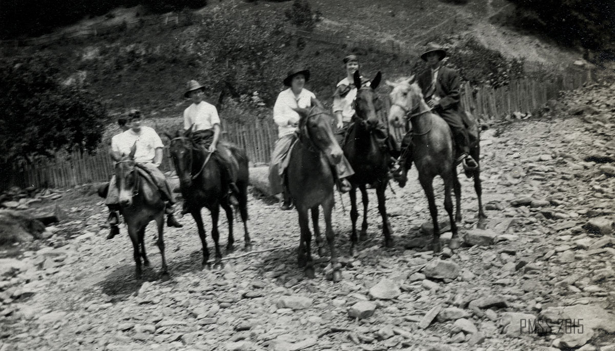 P. Roettinger Album. “Dot and Chester [the mule], Carman, Miss [Ruth] Gaines, Olga, and Oscar [Begley?].” [roe_059a.jpg]