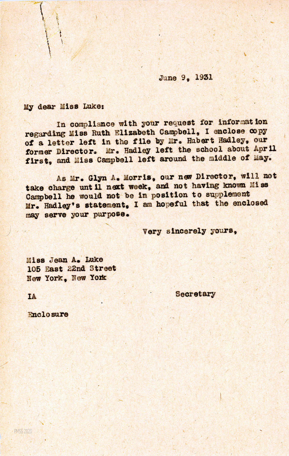 [033] June 9, 1931. To Miss Luke from [unsigned], Secretary, who sends her a “copy of a letter left in the file by Mr. Hubert Hadley, our former Director. Mr. Hadley left the school about April first, and Miss Campbell left around the middle of May.”