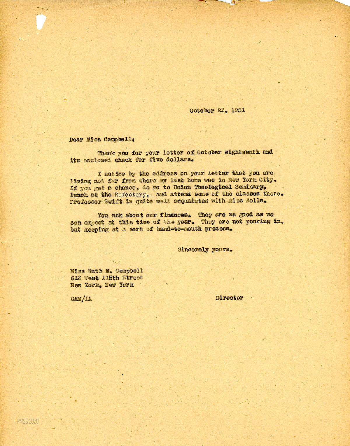 [037] October 22, 1931. To Campbell in NYC from GAM (Morris), Director, thanking her for her check of $5.00. Suggests she visit nearby Union Theological Seminary: “Professor Swift is quite well acquainted with Miss Wells.” About finances, he writes that the School is “keeping at a sort of hand-to-mouth process.”