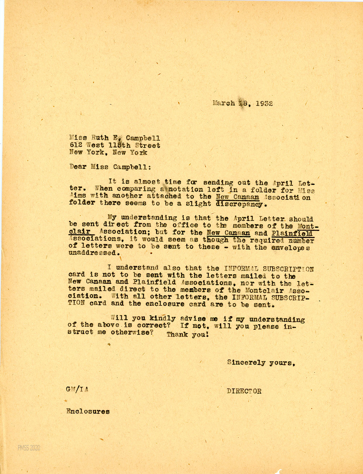 [041] March 18, 1932. To Campbell from GM (Morris), asking her if he understands the instructions (in a folder for Miss Aims, secretary) correctly concerning how items should be mailed to Montclair, New Canaan, and Plainfield associations.