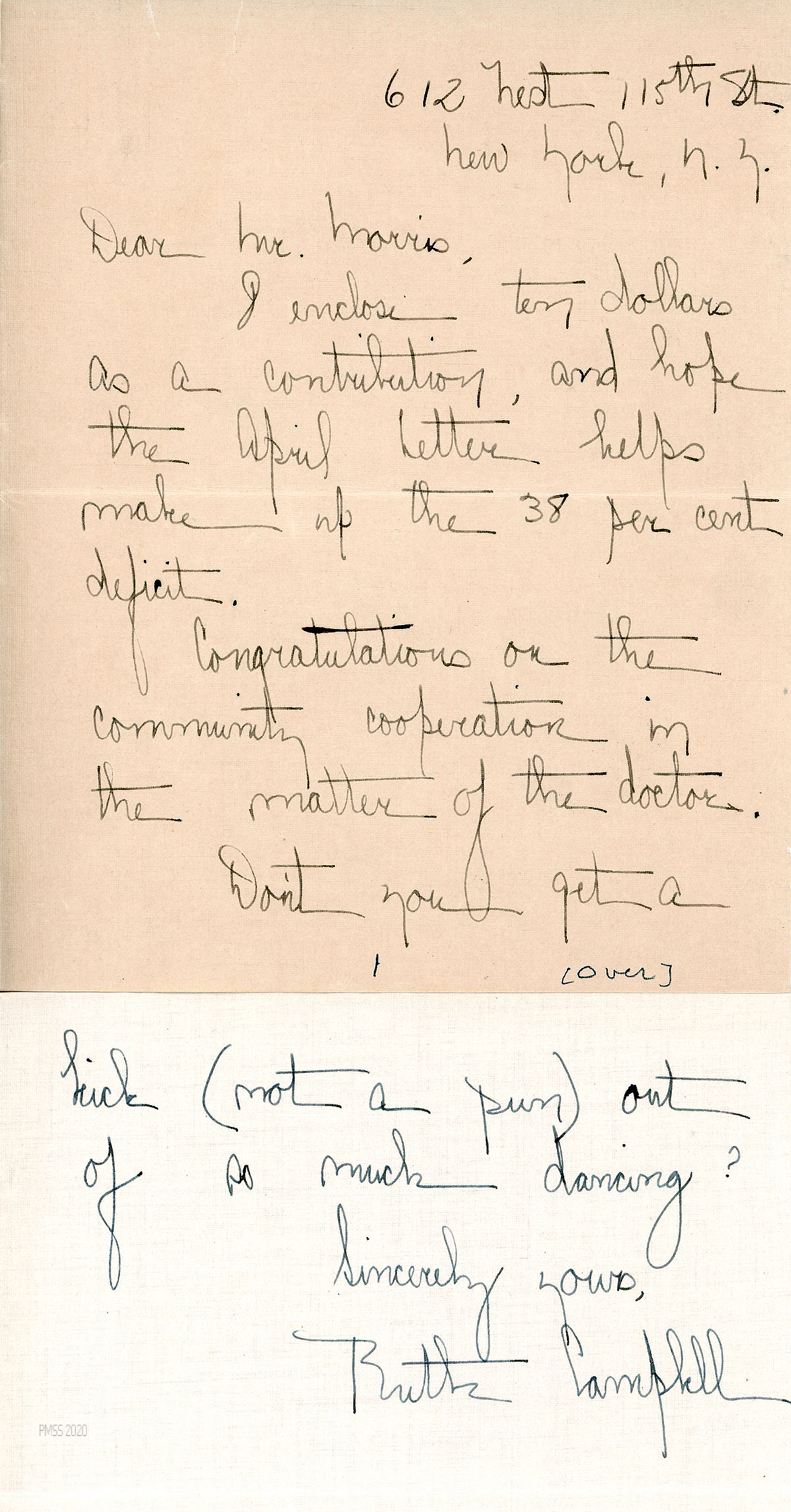 [044] N.D. Two-page letter to Morris from Campbell, enclosing a $10.00 contribution and hopes “the April Letter helps make up the 38 percent deficit.” Asks about his dancing.