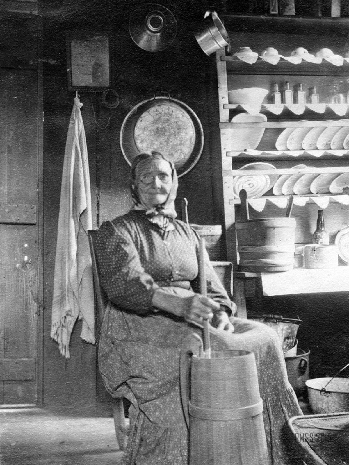 - 016b P. Roettinger Album. “Aunt Sal.” [Seated with butter churn in her kitchen.] [ [roe_017a.jpg]