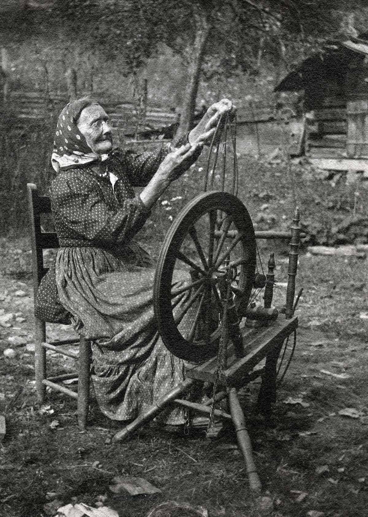 Aunt Sal Creech at her small spinning wheel. [hook_album_2blk__010.jpg]