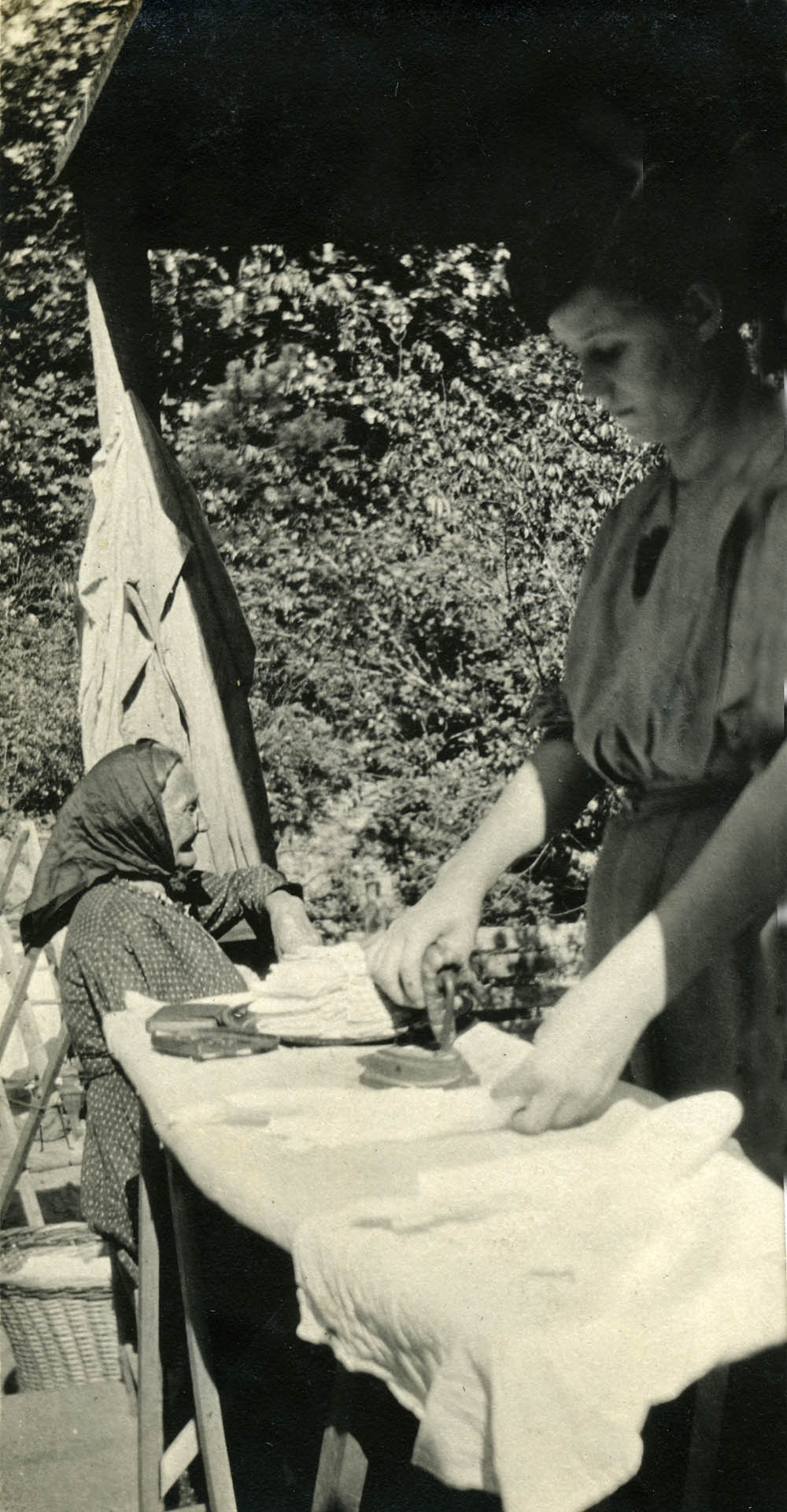 - “Dyeing.” Two women with buckets and vat. [Aunt Sal and Ethel de Long ?] [nace_II_album_062.jpg]