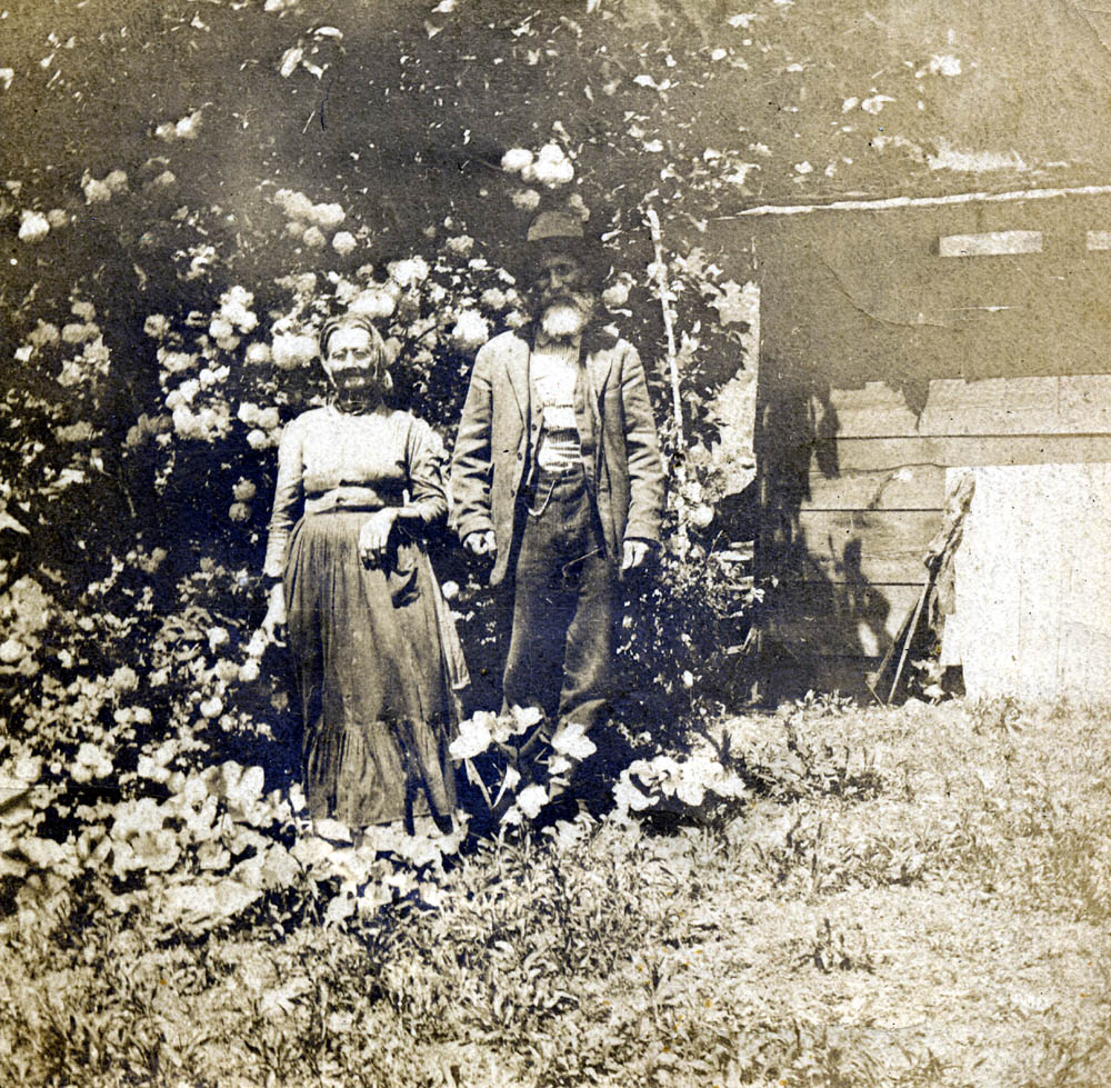 Aunt Sal and Uncle William Creech, in front of their original cabin, celebrating their golden wedding anniversary, 1916. [pmss00019.jpg]