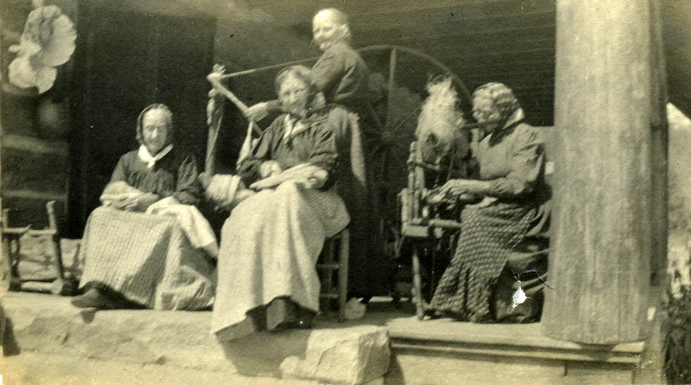 - 0051b P. Roettinger Album. “A Workin’: Aunt “Polly” Mary Ann Shell Day, Aunt Stacey Ellen, Aunt Judy, and Aunt Sal (Sally Dixon Creech)” [roe_017a.jpg]