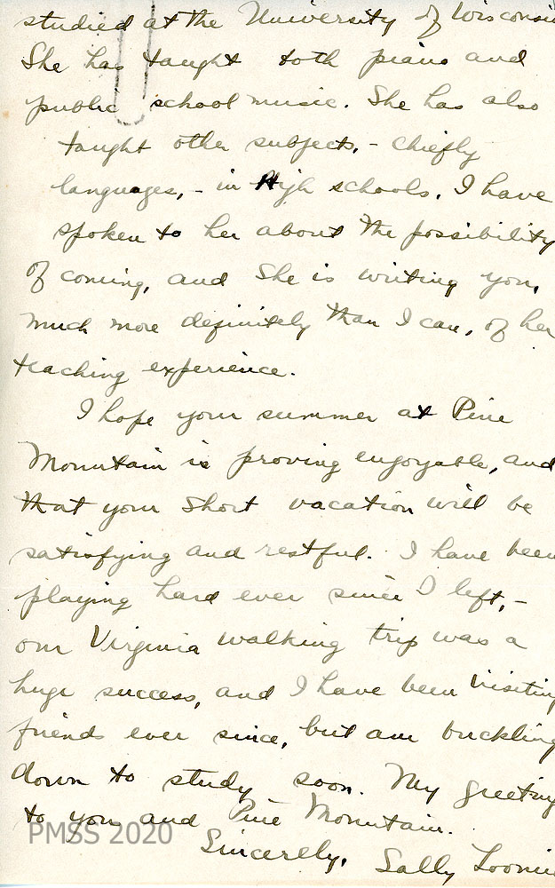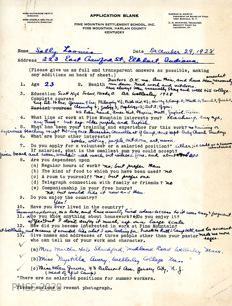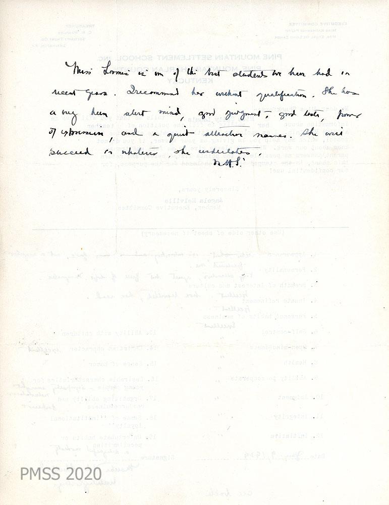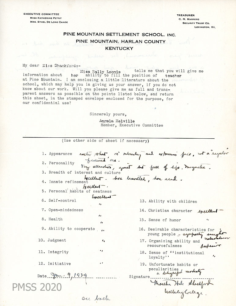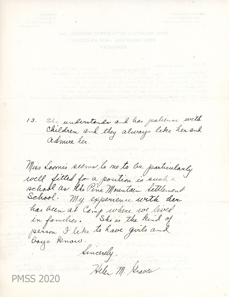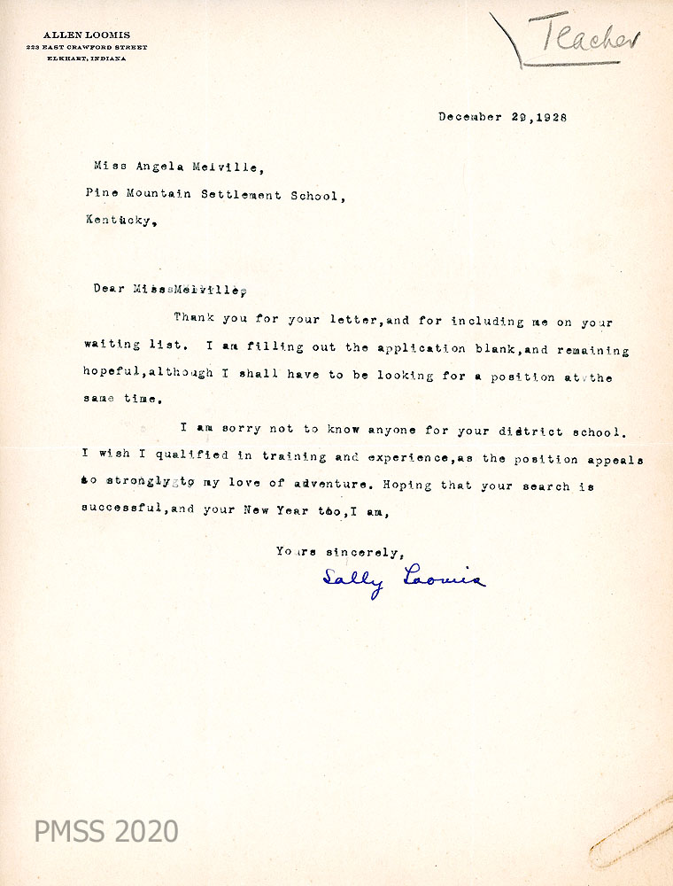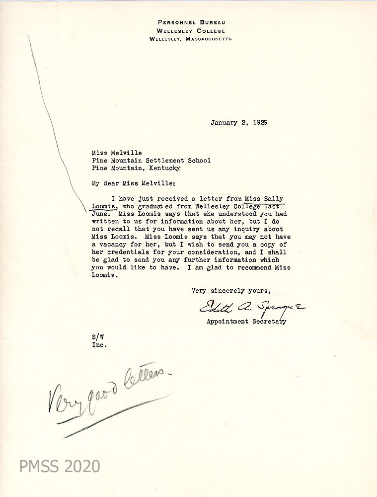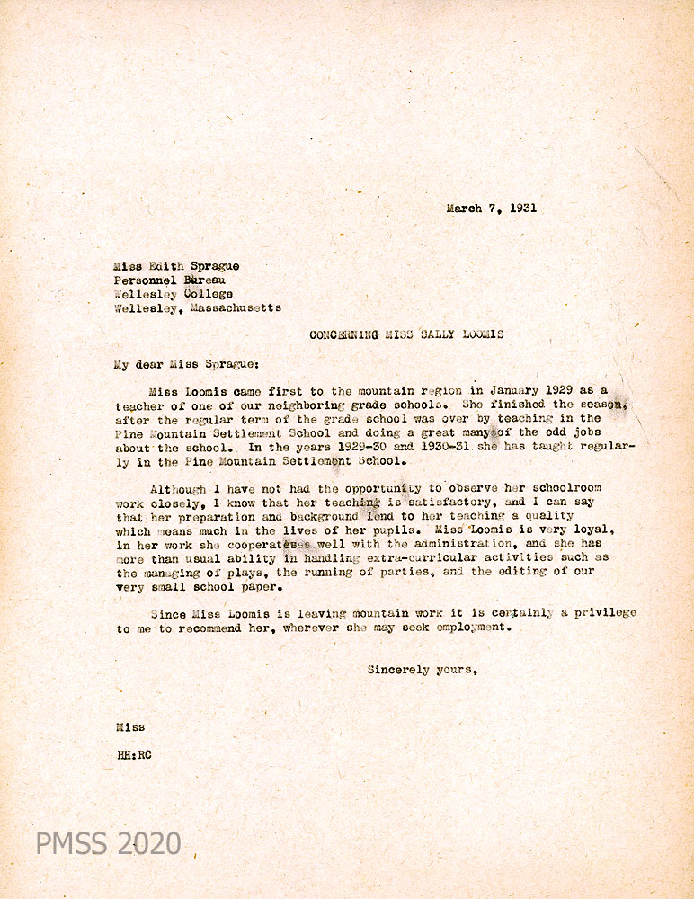 018 March 7, 1931. To Miss Edit Sprague, Personnel Bureau, Wellesley (MA) College from HH [Hubert Hadley, Director]. A general recommendation from the PMSS Director concerning Miss Sally Loomis. She began in the “mountain region in January 1929 as a teacher of one of our neighboring grade schools. She finished the season, after the regular term of the grade school was over, by teaching in the [School] and doing a great many of the odd jobs about the school. In the years 1929-30 and 1930-31, she has taught regularly in the Pine Mountain Settlement School.”