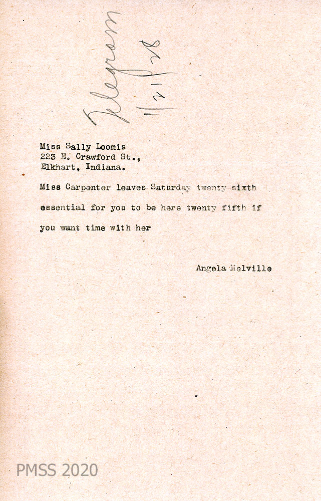 006 N.D. To Miss Sally Loomis in Elkhart, IN from Angela Melville. Handwritten notation at top of page “Telegram 1/21/28 [sic].” Advises Loomis to arrive on the 25th if she wants time with Miss Carpenter.