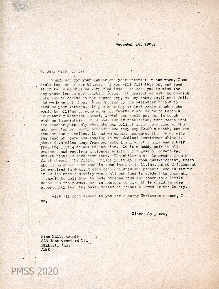 008 December 14, 1928. To Miss Loomis from AM. Encloses an Application Blank; currently no openings except for a grade teacher at the neighboring district school for February and March. “This position is unsalaried; ….the teacher gets only what she can collect from the students … $2.50 a month” and room and board at the Medical Settlement about five miles from PMSS and 1 1/2 miles from the school. Melville describes the qualities the teacher would need to teach and live “in an isolated community where all one does is subject to comment. … [T]he parents are so anxious to give their children more opportunity than the seven months of school allowed by the County.”