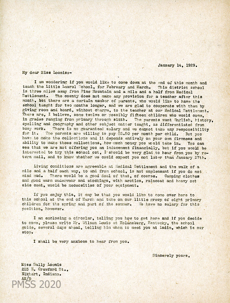010 January 14, 1929. To Miss Loomis from AM. Offers the teaching position at Little Laurel School for February and March. “The county does not make any provision for a teacher after this month, but there are a certain number of parents who would like to have the school taught for two months longer and we are glad to cooperate with them by giving room and board, without charge, to the teacher at our Medical Settlement.” Gives the number of students and grades; the subjects the parents want; the amount the parents will pay per month per child ($2.50); and deadlines for responding to this offer. Advises on living conditions and clothing. Suggests that Loomis could later come to PMSS to teach, unsalaried, eight primary children. Encloses travel instructions and asks her to write to Mr. Wilson Lewis at Nolansburg, KY, the school guide, of her arrival plans, so he can meet her at Ladin.