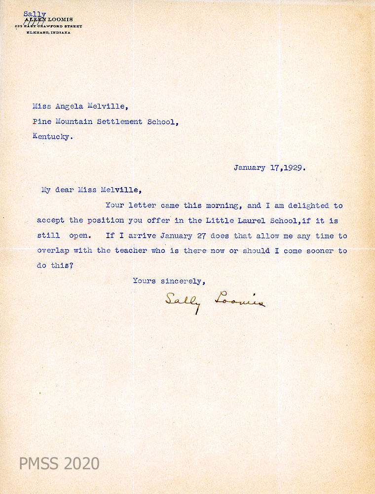 011 January 17, 1929. To Miss Melville from Sally Loomis, who accepts the position at Little Laurel School. Would like some time to “overlap” with the current teacher.