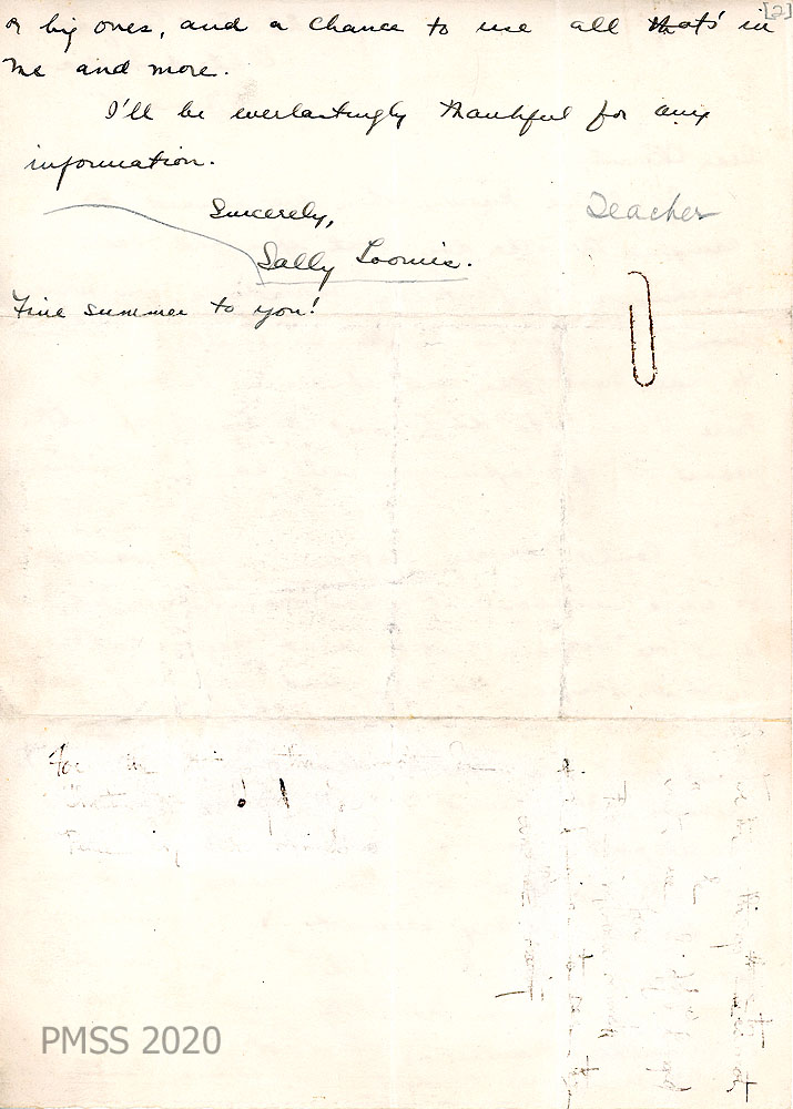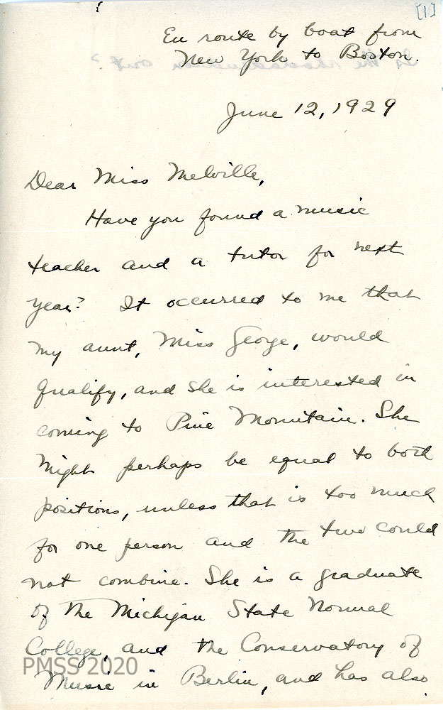 014-014b June 12, 1929. Handwritten three-page letter from Miss Looms to Miss Melville, “en route by boat from New York to Boston.”  [014] Recommends her aunt, Miss [May D.] George, as a music teacher and tutor for PMSS. “She is a graduate of the Michigan State Normal College and the Conservatory of Music in Berlin, and has also [014a] studied at the Unversity of Wisconsin. She has taught both piano and public school music…[and] other subjects – chiefly languages – in high schools. She is writing you….”  [014b] “Is the rhododendron out?”