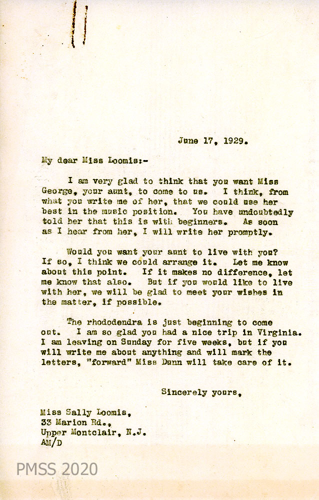 015 June 17, 1929. To Miss Sally Loomis in Upper Montclair, NJ, from AM, who expresses interest in Miss George’s teaching music at PMSS. Asks about living arrangements.