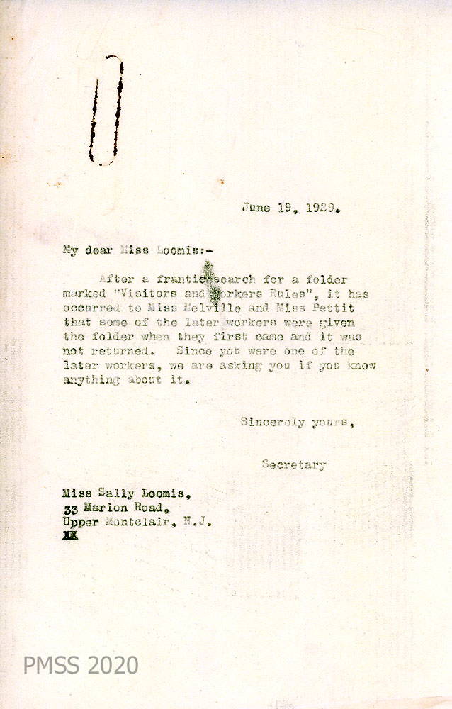 016 June 19, 1929. To Miss Loomis from [unsigned] “Secretary.” Asks Loomis if she has a folder marked “Visitors and Workers Rules.”