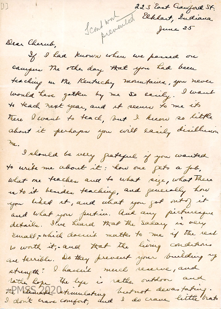 017-017a June 25, [no year]. Handwritten two-page letter to “Cherub” from Sally Loomis. [Notation at top of page: “Scout work prevented.”] [017] Expresses her desire to teach next year and asks for information since “you had been teaching in the Kentucky mountains” and how to go about applying to that area; explains her preferences.  [017a] Closing and signature.