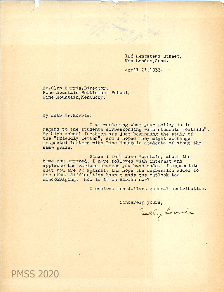 020 April 21, 1933. To Mr. Glyn Morris, Director, from Sally Loomis. Asks if her high school freshmen could exchange letters with Pine Mountain students of about the same grade. Asks about Pine Mountain; encloses $10 contribution.
