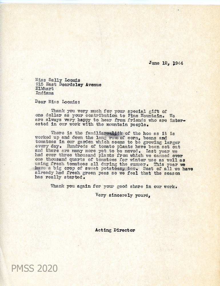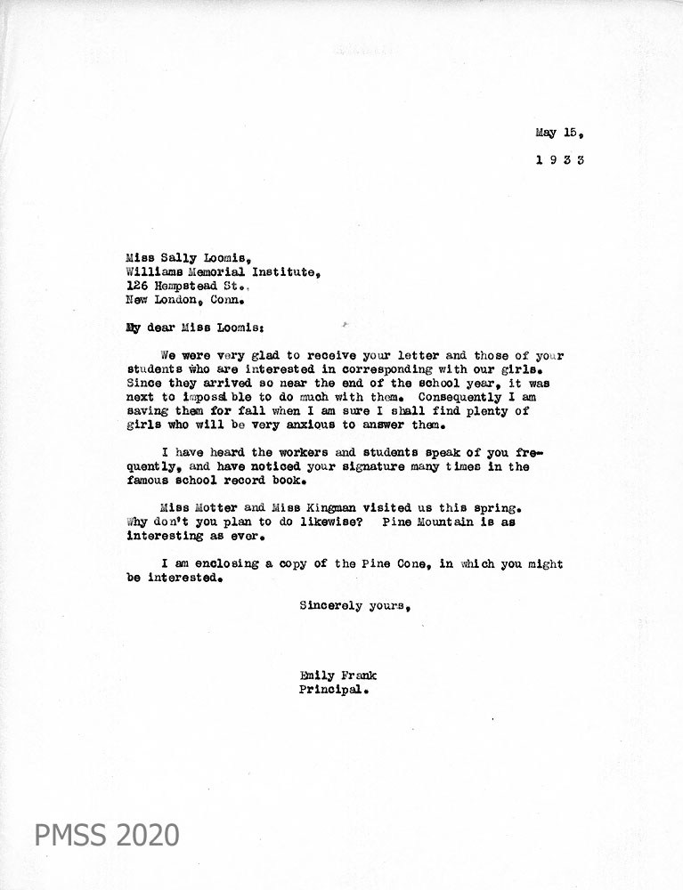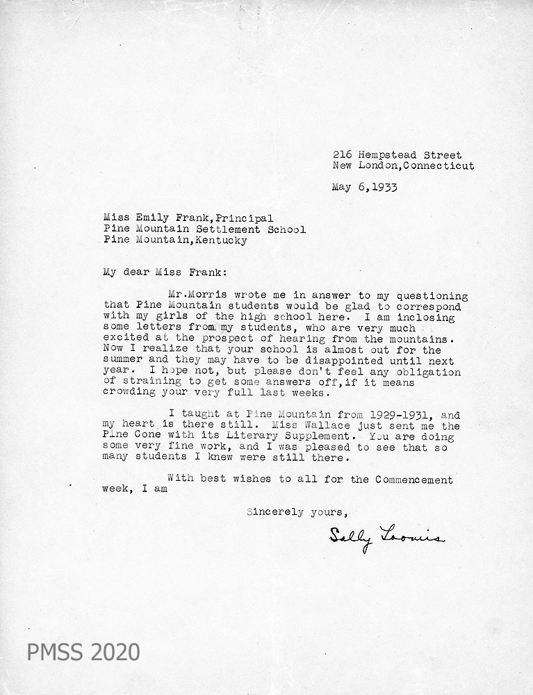 022 May 6, 1933. To Miss [Emily] Frank, Principal, PMSS from Sally Loomis in New London, CT, who encloses letters from PMSS students, “who are very much excited at the prospect of hearing from the mountains. … I taught at Pine Mountain from 1929-1931, and my heart is there still. Miss Wallace just sent me the Pine Cone with its Literary Supplement. You are doing some very fine work, and I was pleased to see that so many students I knew were still there.”