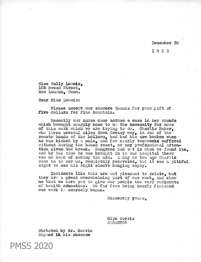 024 December 30, 1933. To Miss Sally Loomis from Glyn Morris, Director, thanking her for her $5.00 gift and relates an anecdote about Charlie Baker that shows “us that we have yet to give our people the very rudiments of health education.”