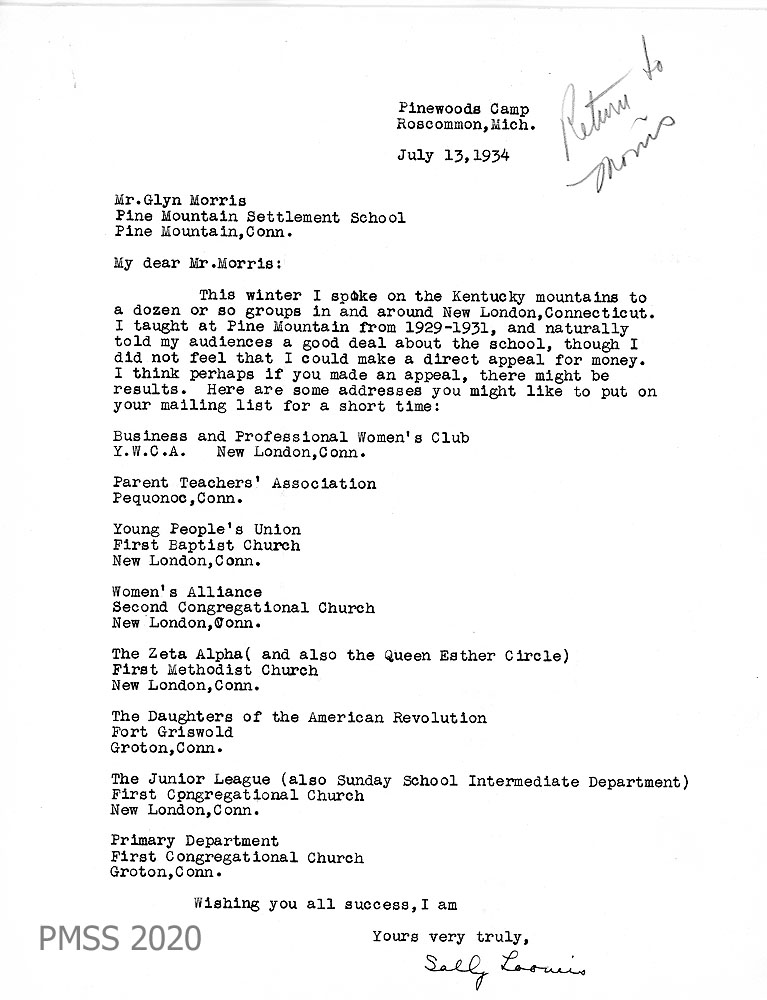 025 July 13, 1934. To Glyn Morris from Sally Loomis at Pinewoods Camp, Roscommon, MI. Loomis had given a talk about the Kentucky mountains “to a dozen or so groups in and around New London, CT.” She lists the names of the organizations and suggests that Morris make an appeal for money to them.