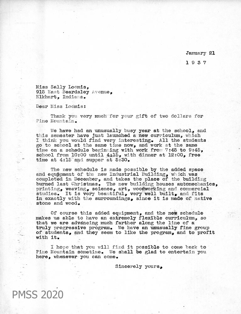 027 January 21, 1937. To Miss Sally Loomis in Elkhart, IN, from [unsigned]. She is thanked for her $2.00 gift and given PMSS updates: new school schedule, new Industrial Building that replaces the burned one and the classes it houses, indicating advances toward a progressive program.