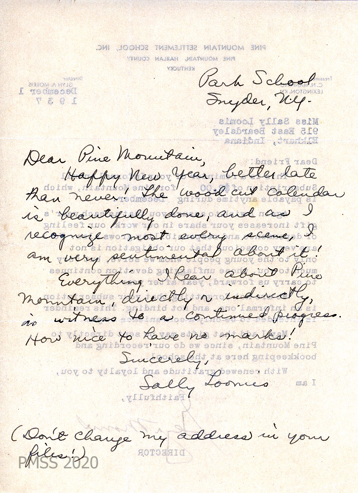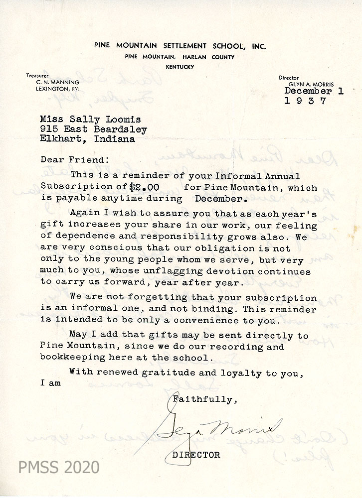 028-028a [028] N.D. To “Pine Mountain” from Sally Loomis at Park School, Snyder, NY. [Handwritten note on the reverse side of a “Dear Friend” letter dated December 1, 1937]. “The woodcut calendar is beautifully done, and as I recognize most every scene, I am very sentimental about it! Everything I hear about Pine Mountain, directly or indirectly, is witness to a continued progress.” [028a] December 1, 1937. “Dear Friend” letter, reminding Loomis of her “Informal Annual Subscription of $2.00…” [signed] Glyn Morris, Director.