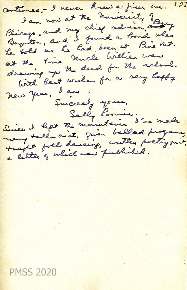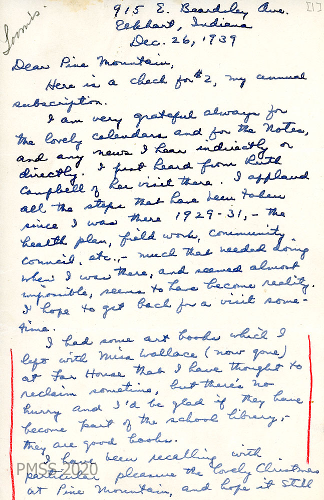 029 December 26, 1939. Handwritten two-page letter to “Pine Mountain” from Sally Loomis in Elkhart, IN, [029] who enclosed a $2.00 check for her annual subscription. She is grateful for the calendars, Notes and any news; heard that Ruth Campbell visited; applauds PMSS’s improvements, such as “health plan, field work community council, etc.” Offers the art books she left behind to the school library; remembers PMSS Christmas. [029a] “I am now at the University of Chicago, and my chief advisor, Percy Boynton, and I found a bond when he told me he had been at Pine Mt. at the time Uncle William was drawing up the deed for the school.”