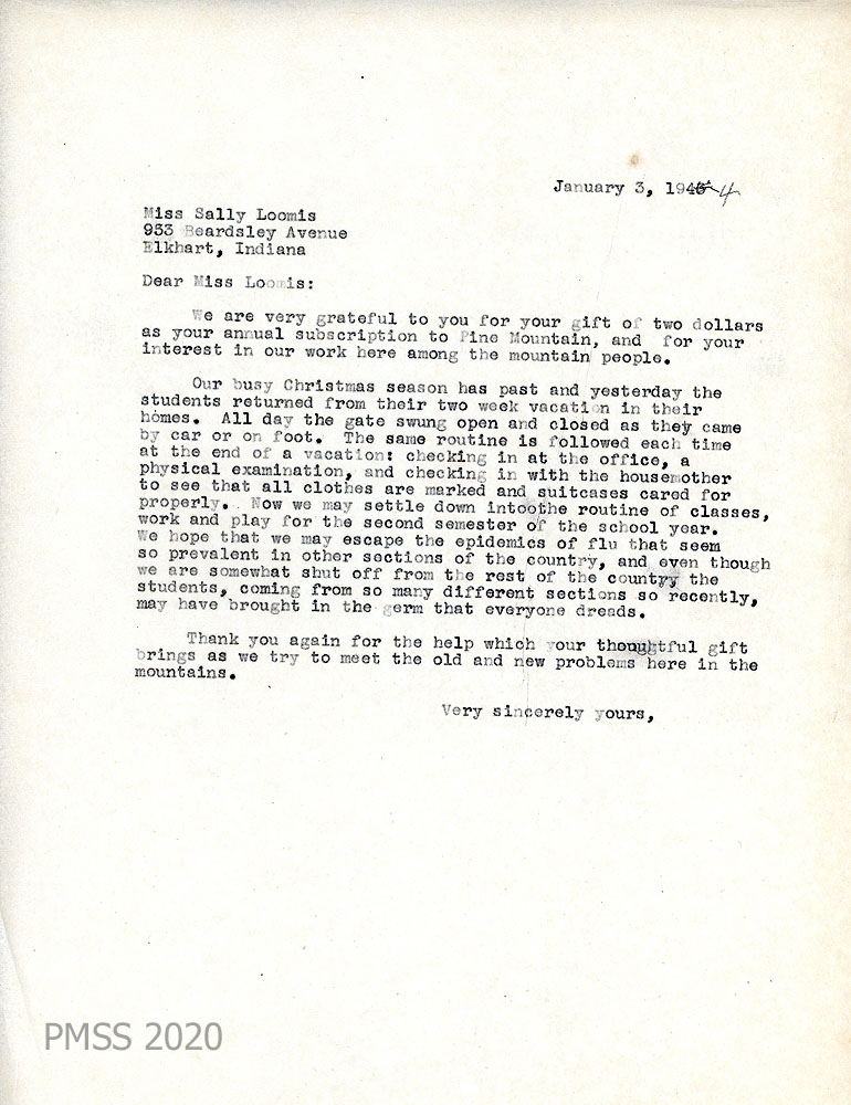 030 January 3, 1944. To Miss Sally Loomis in Elkhart, IN, from [unsigned]. A thank-you letter for her $2.00 annual subscription payment and for her interest. Students are returning after their Christmas vacation and going through the entrance routine, which the letter describes. PMSS hopes to escape the flu epidemic, even though students may bring it from their homes.