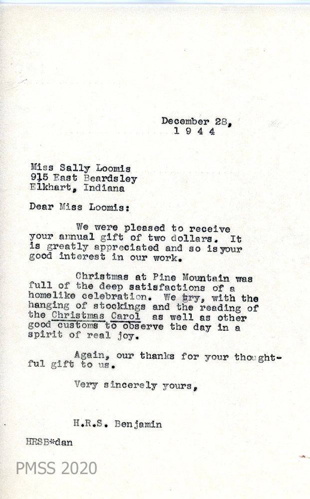 032 December 28, 1944. To Miss Sally Loomis from H.R.S. Benjamin [Director], thanking Loomis for her annual gift; describes Christmas at Pine Mountain.